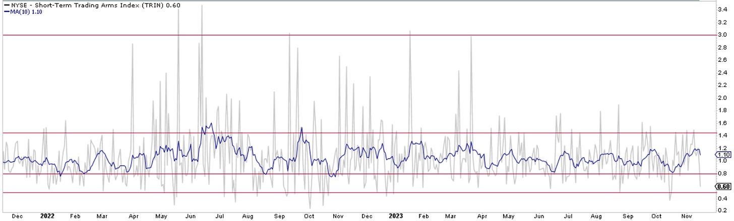 Speaking of market internals, below you see what is called TRIN index. It compares the number of advancing and declining stocks to the volume of both advancing and declining stocks. As you can see below it hit a pretty extreme value of 0.60 today. Previous instances when this happens tend to coincide with nearby market tops. A TRIN value that drops below 0.50 indicates an overbought market with an overheated bullish sentiment. The blue line is just a simple 10-day MA of the indicator to smooth out volatility.