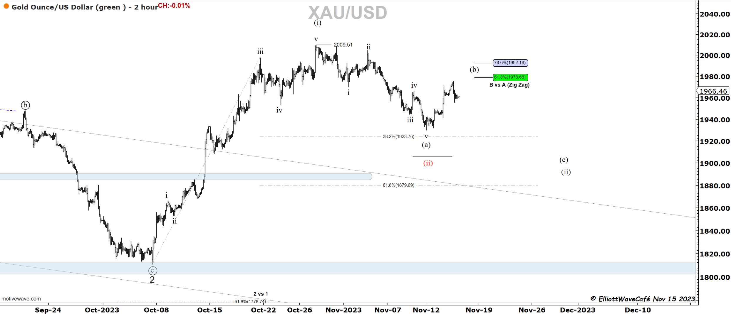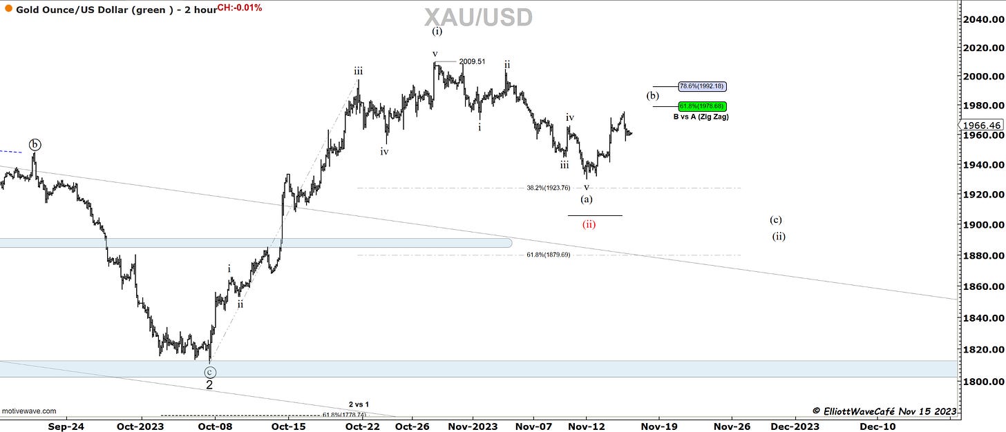 Gold has rallied about 61.8% of the latest decline. It’s about as high as I would like to see wave (b) of a zigzag travel. My expectations are for a wave (c ) to ensue to complete wave (ii). If we travel above 78.6 that expectation will start to diminish and the 5-wave decline might need to be labeled as an ABC. But one thing at a time.