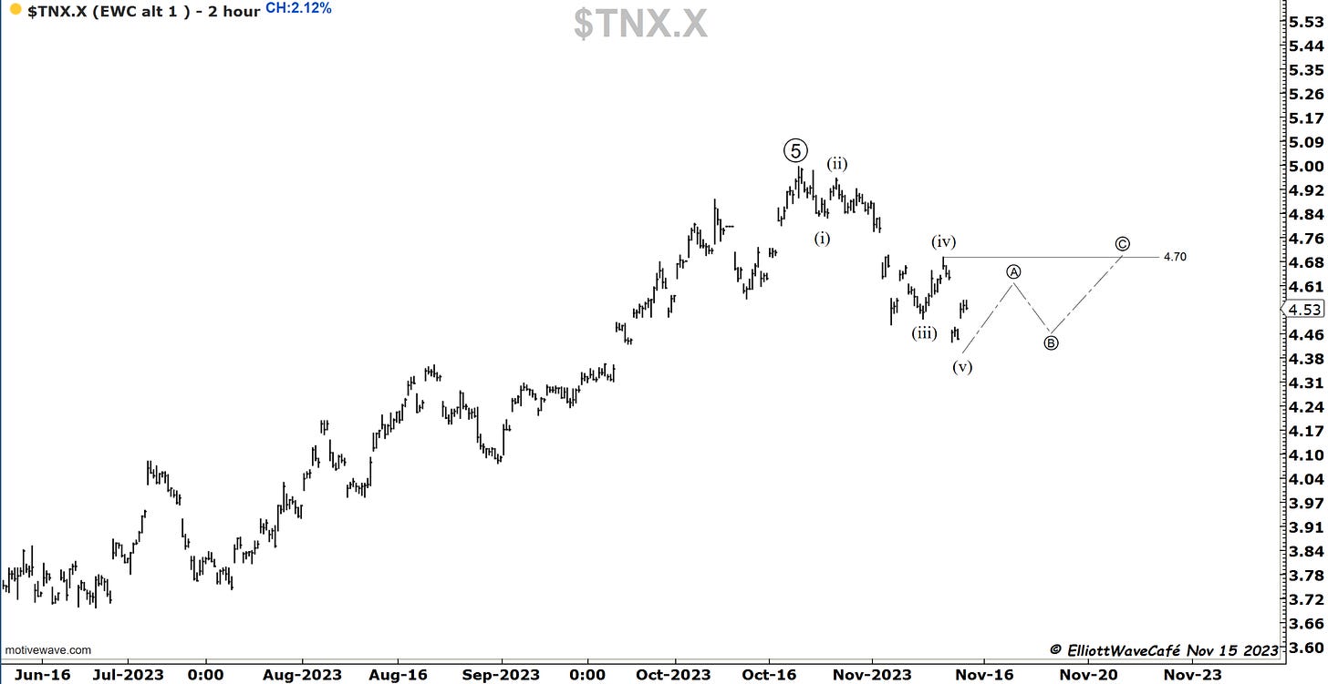 We got a 2% rally in yields today. This is in line with my expectations for a 3-wave setback towards 4.70 or above. Will monitor this, but sentiment toward lower yields straight away and calls for 4% are a bit premature. Markets love to take their time and create frustration. Why would they make it easy?