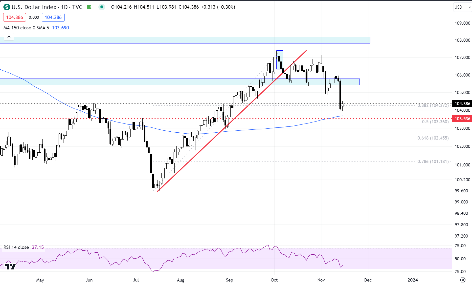 The dollar has taken a pause today just above the key 103.50 level. So it happens that the 150day MA sits there as well. I think we hold here for a while maybe even attempt to get back near 105.