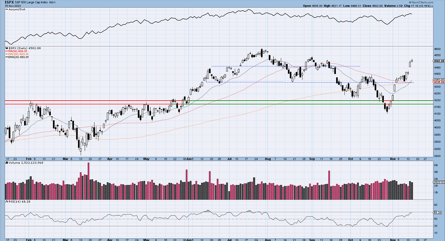 On this daily chart, we see the little indecision candle displayed today at the 4500 resistance. It’s a small clue of further pause and churn. If it is followed by a down close tomorrow, the whole pattern will grow in importance. For now, it’s only a flashing yellow. All the moving averages are converging in the same spot near 4340, so from that perspective we have no established trend in either direction over the past 50 or even 150 days.