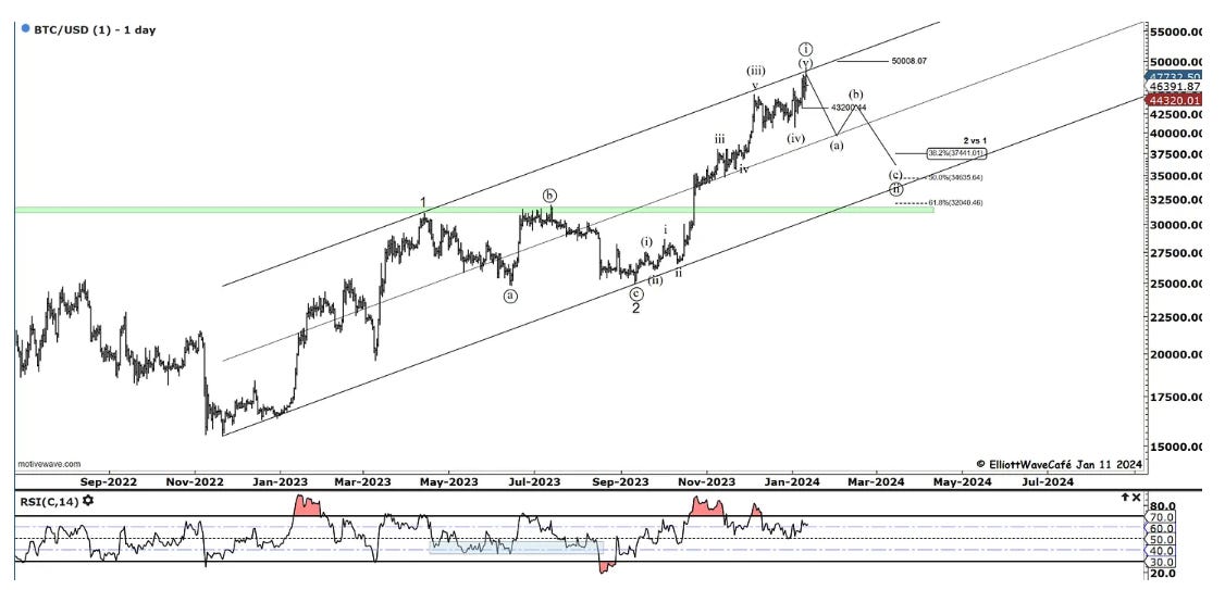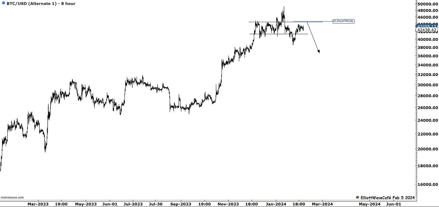 Bitcoin has had several attempts to break 43,800 but has so far been unsuccessful. I think it would make the wave structure a bit cleaner in terms of an abc if it does. I think one is right to think short below 45k and prepare bullish above.