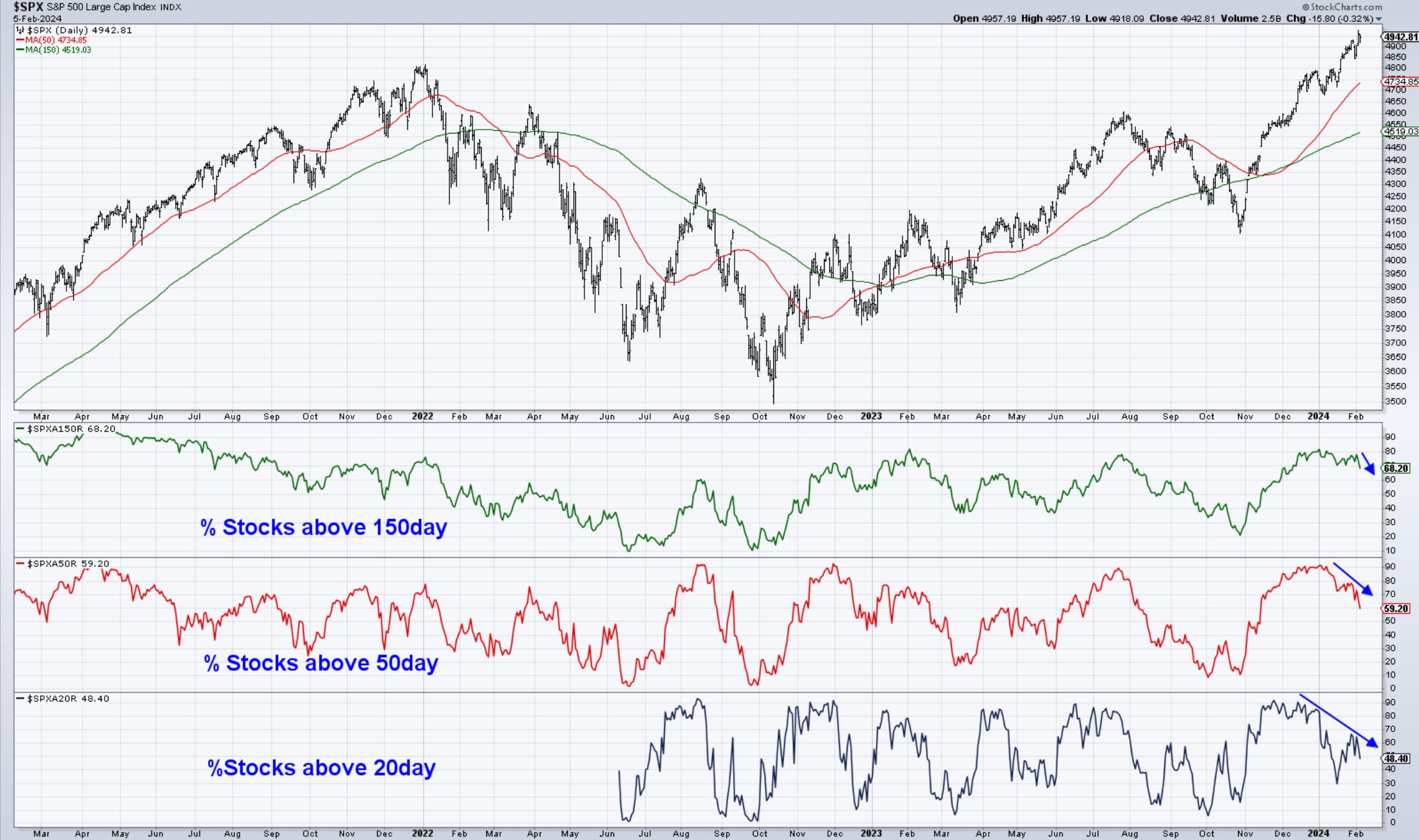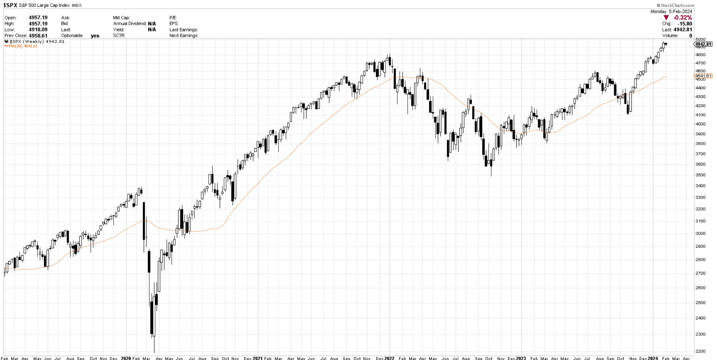 Pricewise, looking at a weekly chart of the SP500, we have very little evidence of anything correcting on the horizon. 4800 is the peak from two years ago. Getting below there is needed to get thinking about 4600, which would equate with a basic 7-8% correction.