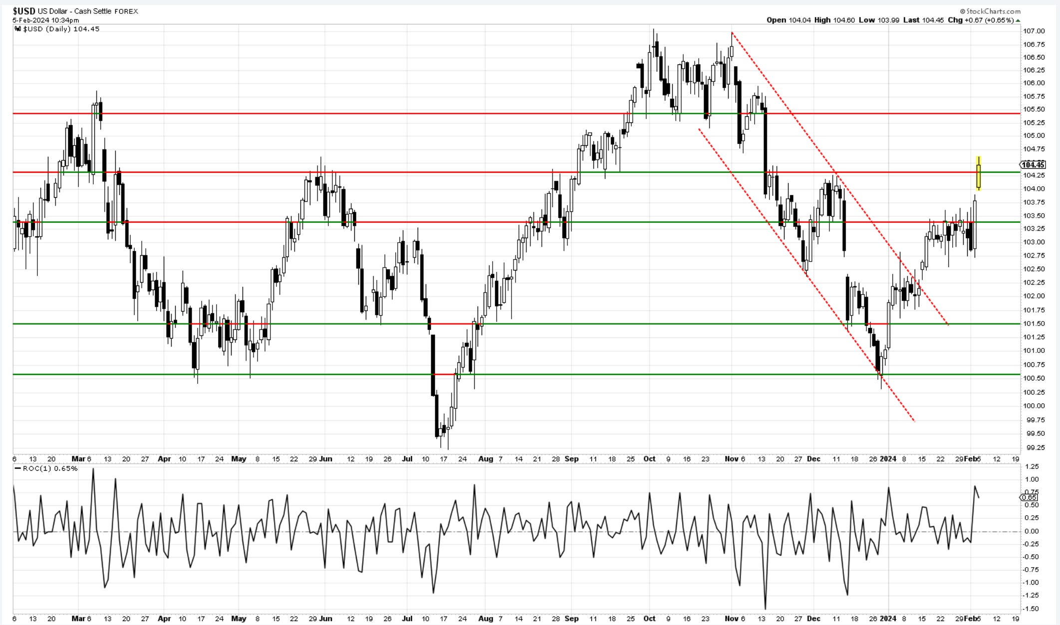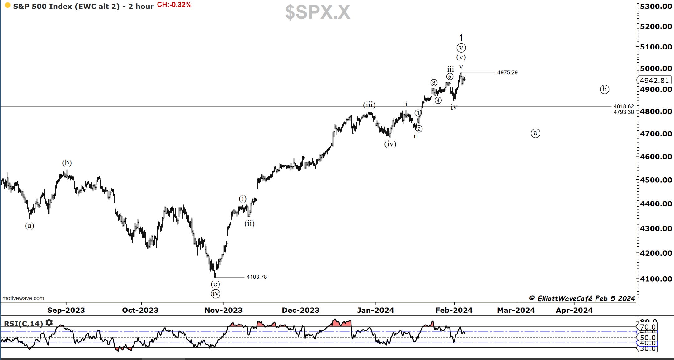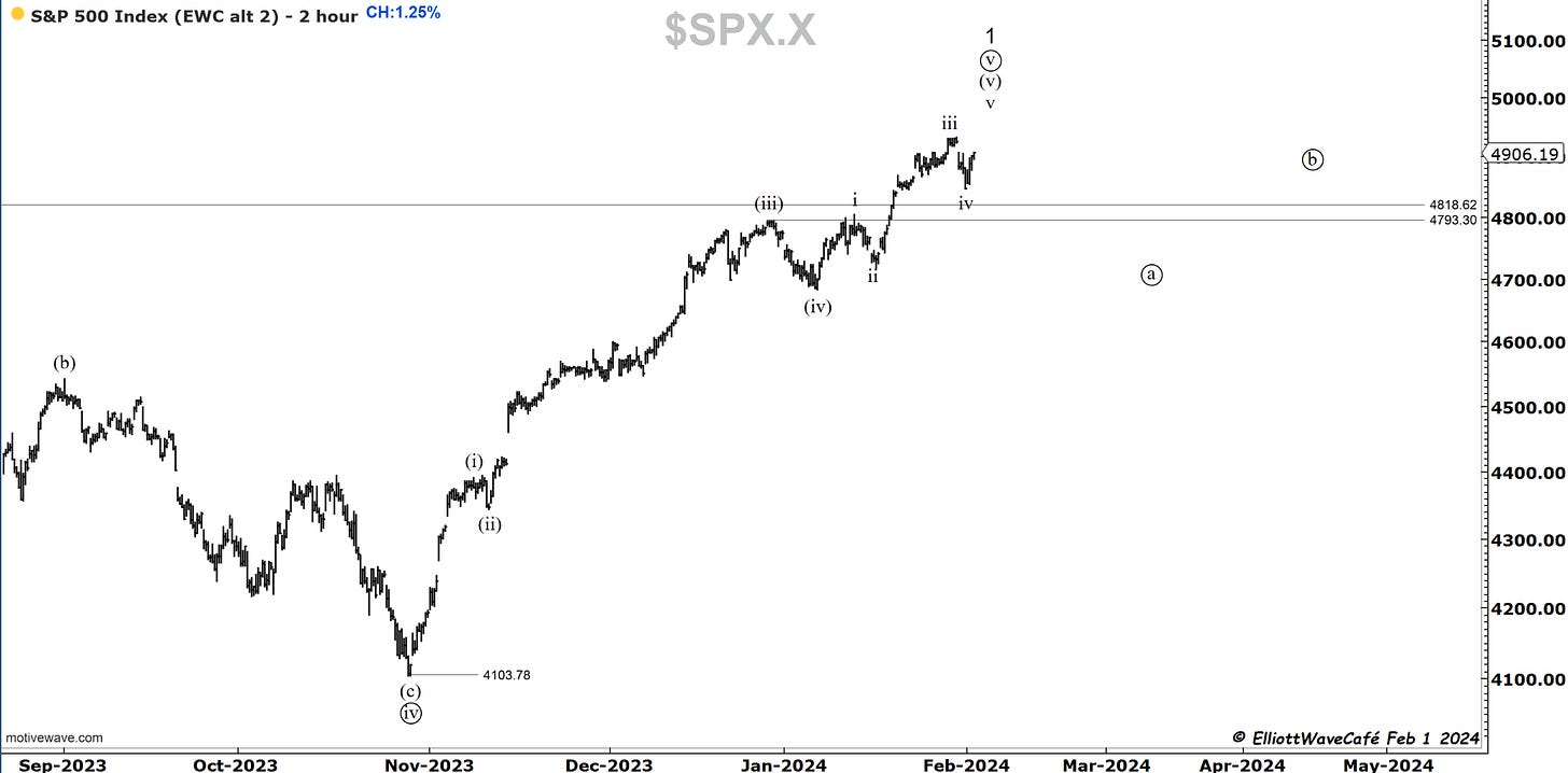 The strength of the job report on Friday last week created some initial selling on calls for lower chances of rate cuts, but then it quickly made a fresh new high towards 4975. This unfolded in line with the expectations for another wave up in (v). The markets pulled back into Friday’s close and followed with a bit more weakness today by failing to register a new high. On the NYSE, we had about 5 times as many declines as gains on decent declining volume. This deteriorating breadth has been a signature event for a while now. Few strong stocks continue to support the tape. In addition, both dollar and yields have risen strongly, supporting a case of risk-off mode approaching rapidly.