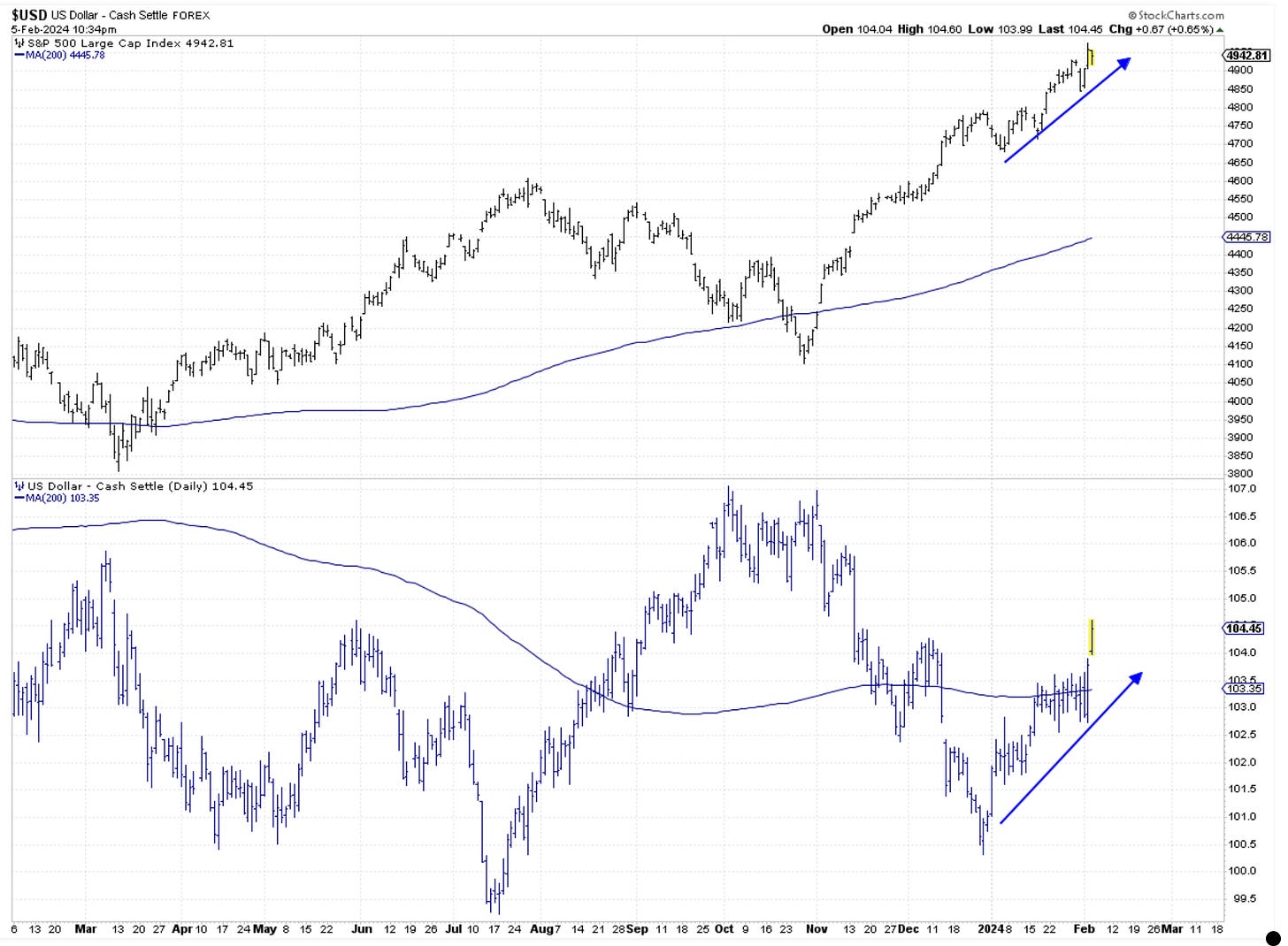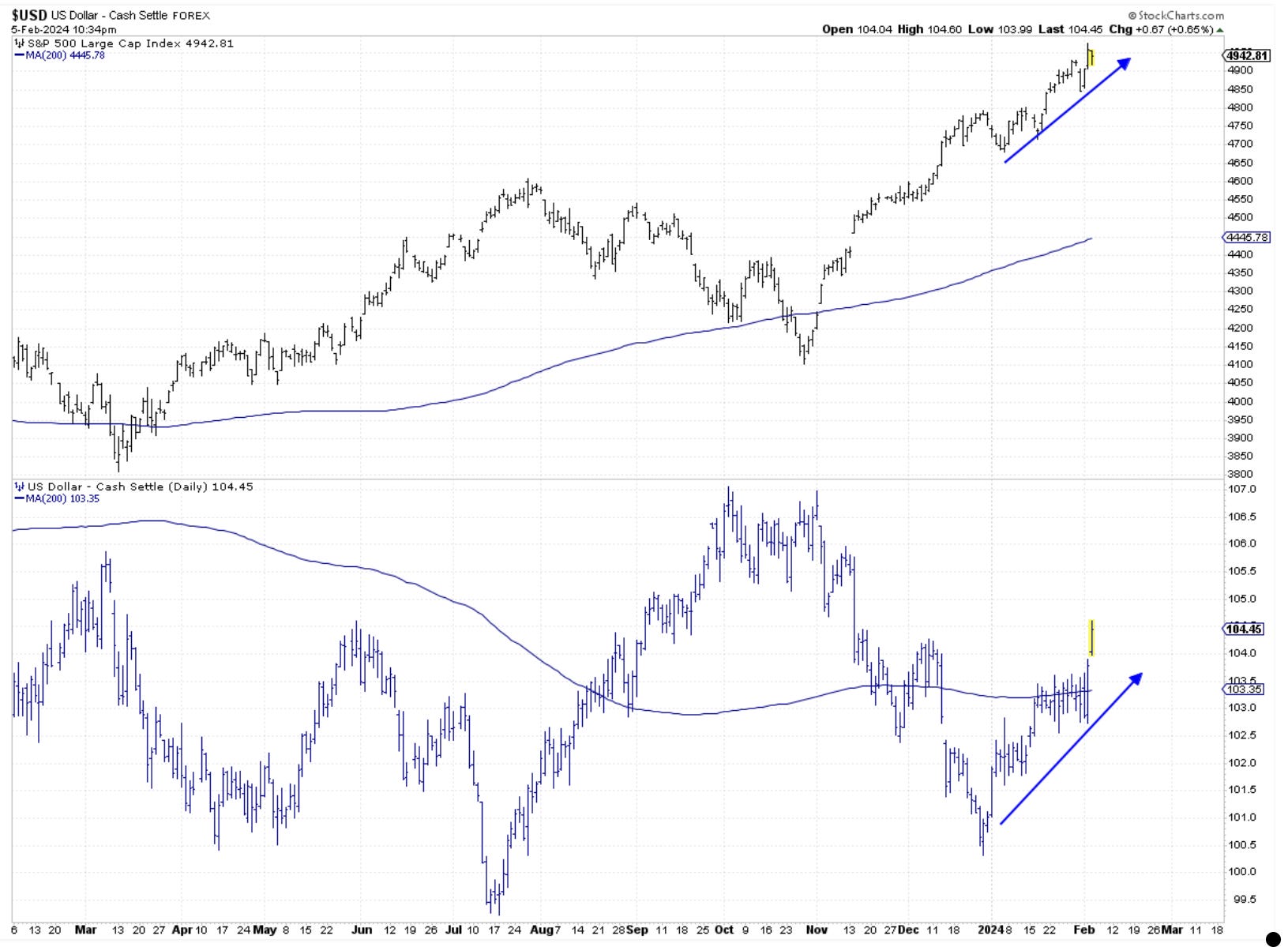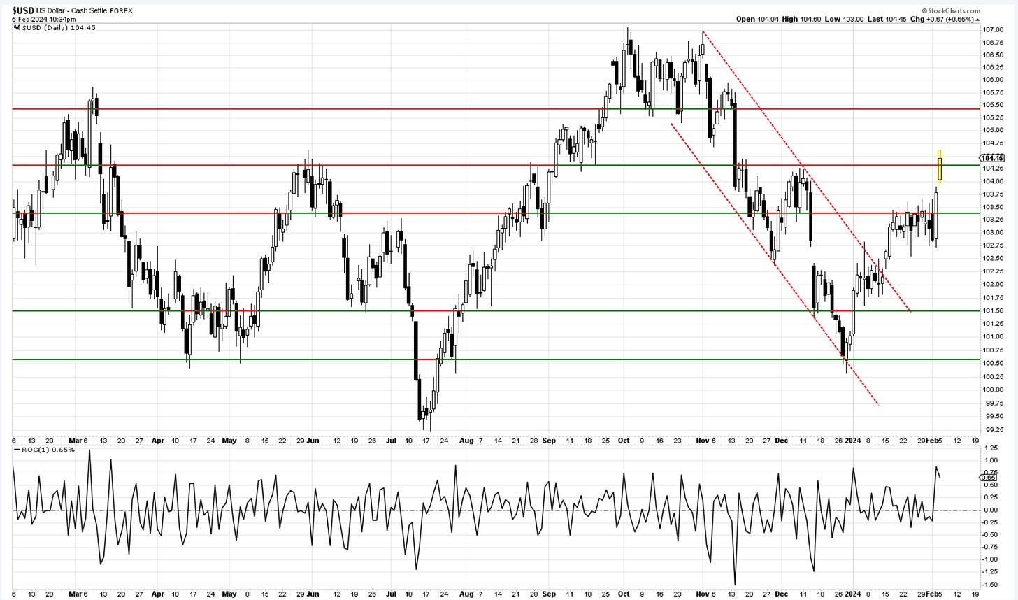 The dollar liked the NFP report on Friday. It shot higher and broke above that messy consolidation we observed last week. Today, there was more following, which adds to the significance of the breakout. In the currency world, rate differentials are a big deal. In simple terms, if the Greenback offers more yields than its counterparts, then money will flow to it. How do we calculate this? By looking at central banks around the world and seeing where they are in their monetary cycles. With Fed not needing to cut rates right away and Europe maybe needing to, the Euro will get dumped in favor of the dollar. Interestingly enough, since end of last year, both the dollar and stocks have been moving higher. This temporary correlation is unlikely to last much longer. In even more simple terms, the cost of money is going up.