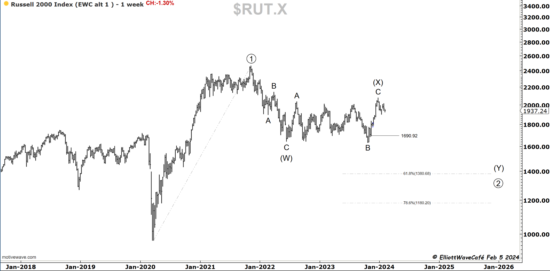 I want to give you something to think about as an alternative to the bullish view on small caps. The chart below depicts a corrective move unfolded in wave (X), and it won’t be until a final flush in wave (Y) that this market will truly become ready for upside primetime. Looking at the chart, this happening is not at all out of the realm of possibilities. We will keep this on the back burner and monitor it closely.