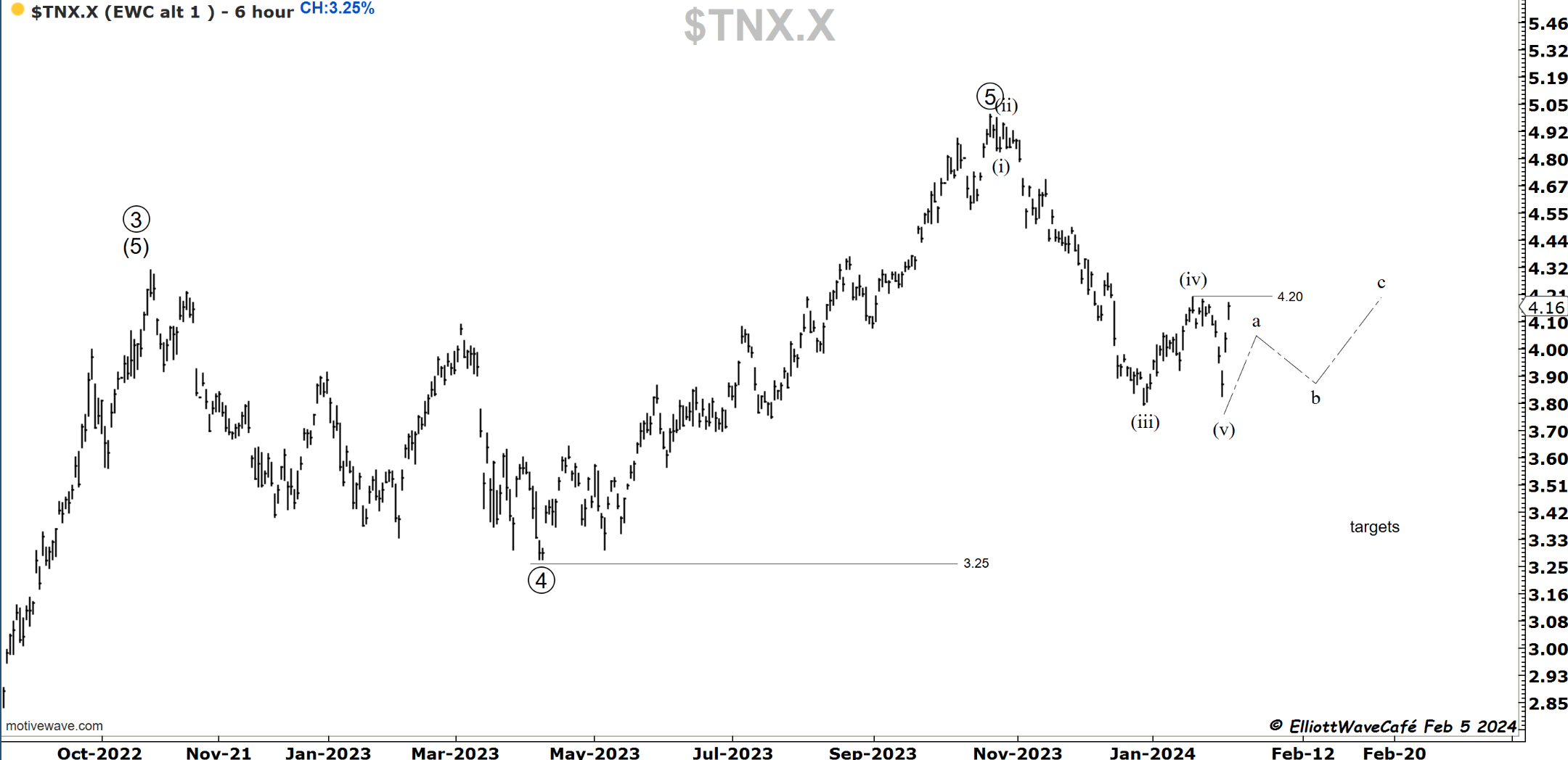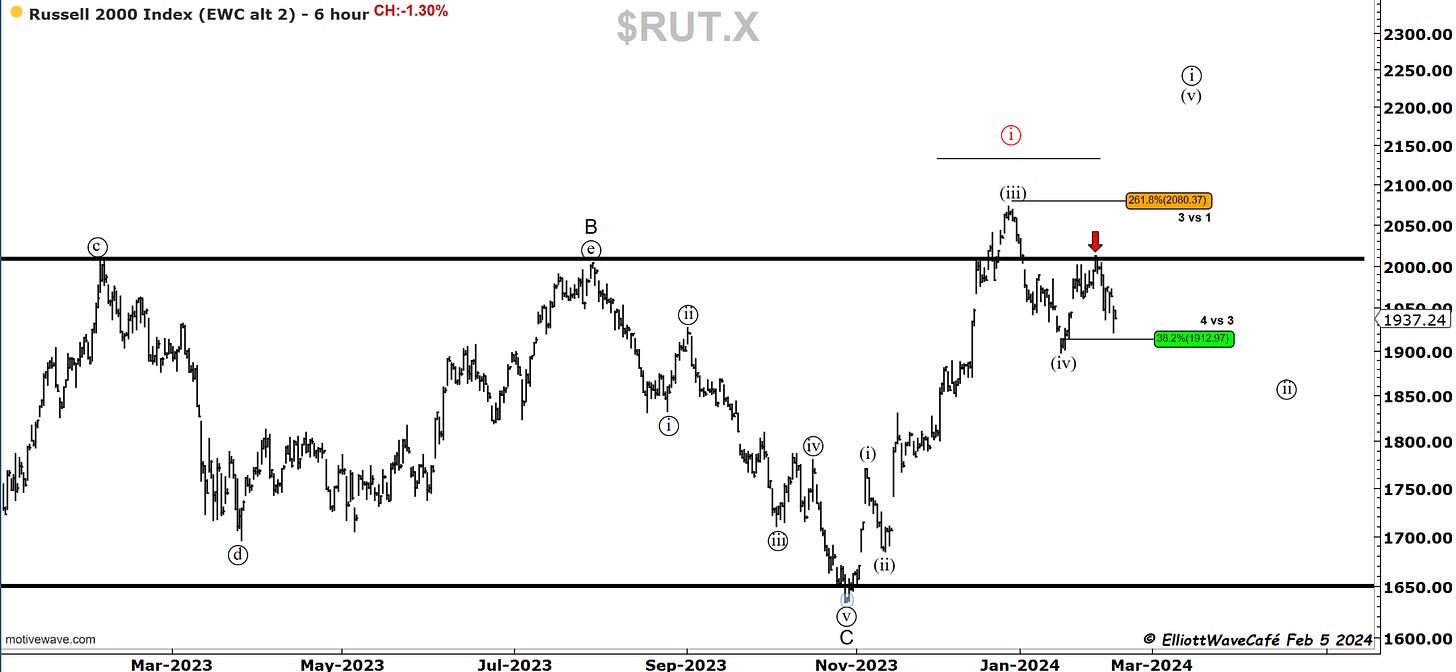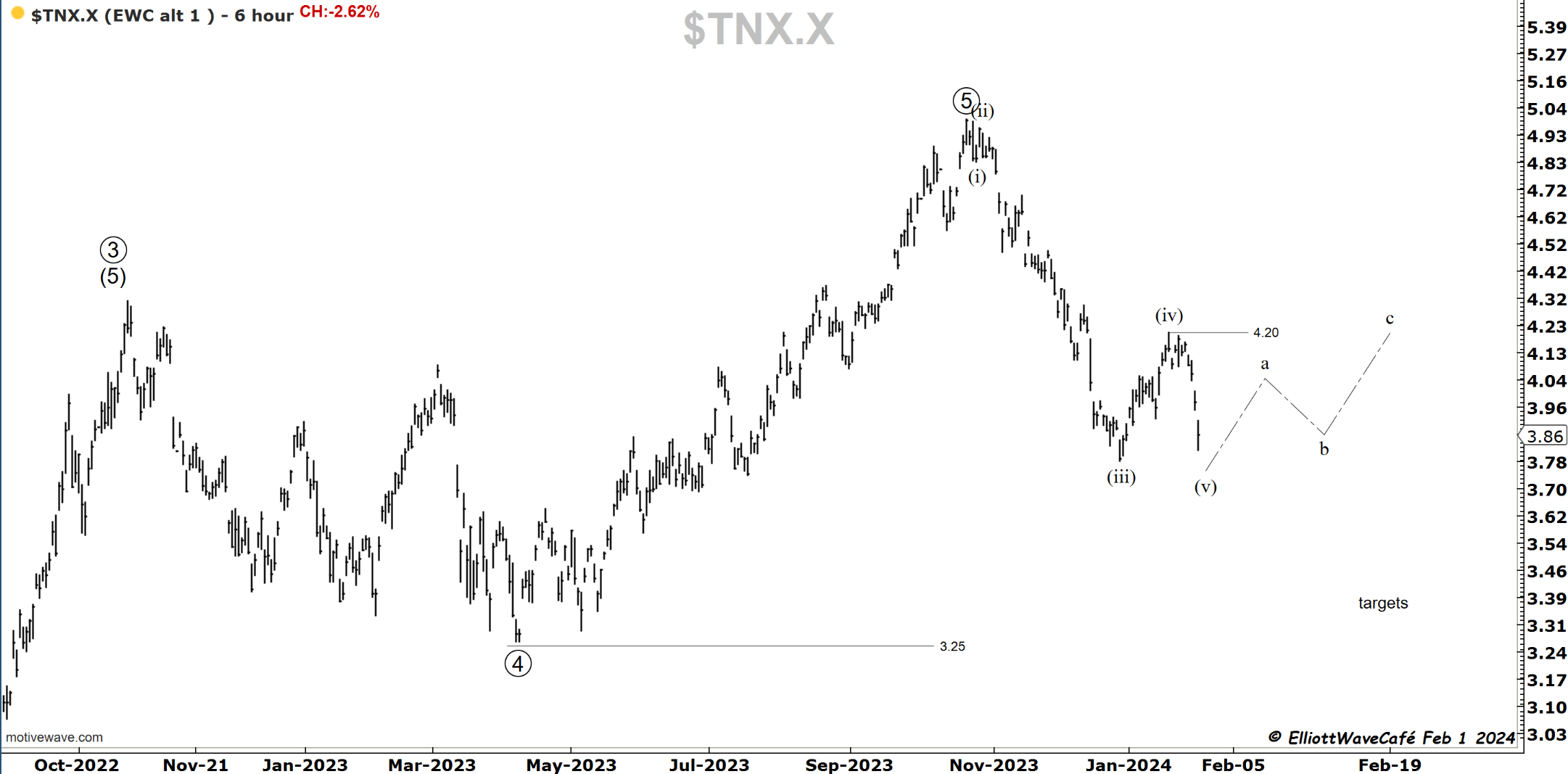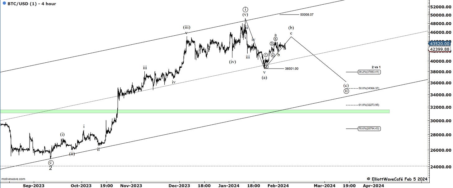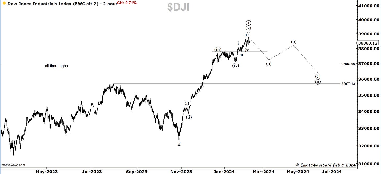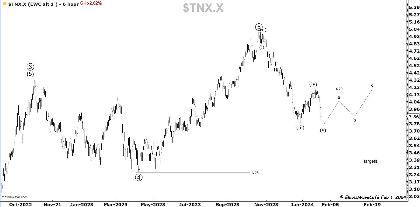 That was indeed a 3wave rally into 4.20. I thought it was going to be running slightly higher, but it never did. The move lower is sharp and comes at a time when the Fed says there is likely no rate cut in March. Weird move lower. What does the bond market hint at? It’s quite possible it was a wave (v) to get people bearish yields only to be followed by the real correction higher back above 4.20%. It would be in line with the FED and the cycles shown in previous issues.