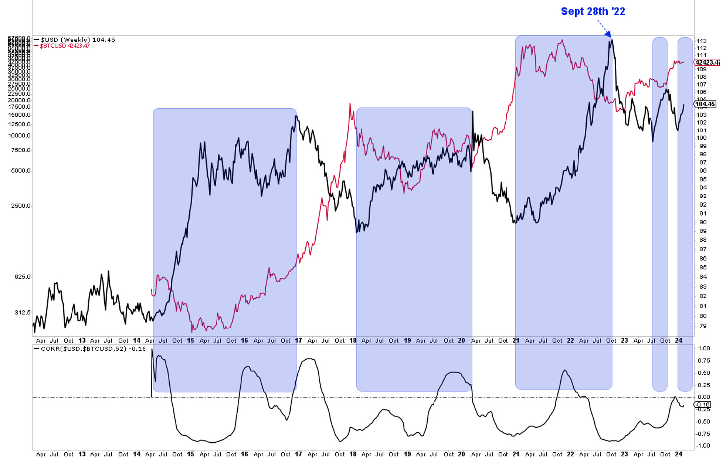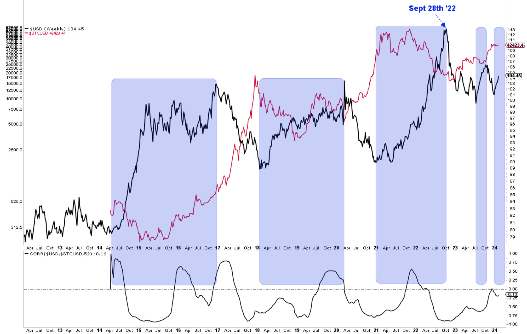 Here is the chart from Jan 11th, which we prepared ahead and at the time of ETF's launch. The second one is updated as of today and remains the main focus until enough bullish evidence creeps in to change that view. I am also thinking of a strong dollar / BTC correlation. You can see that in the last chart. Periods in blue are stronger dollar environments. Bitcoin price action has been actually lackluster since the Dollar bottomed at the end of last year.