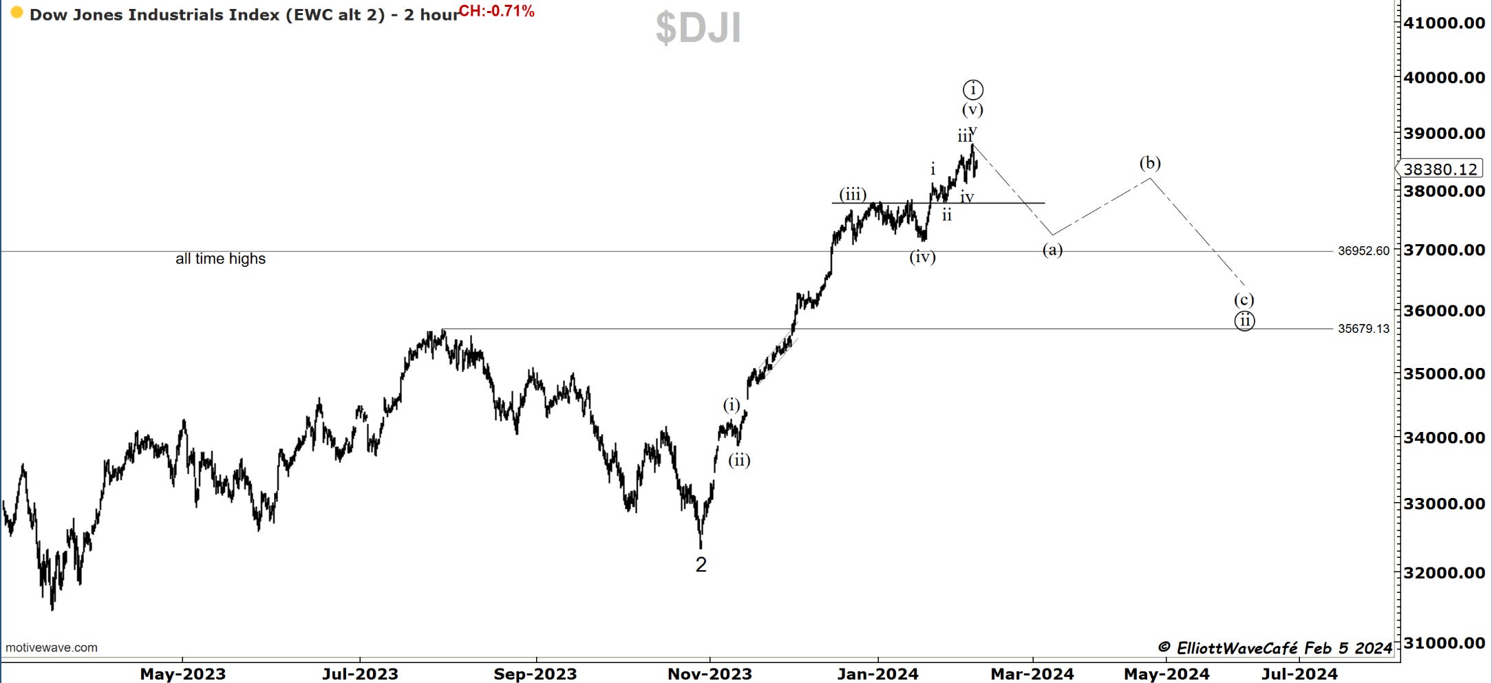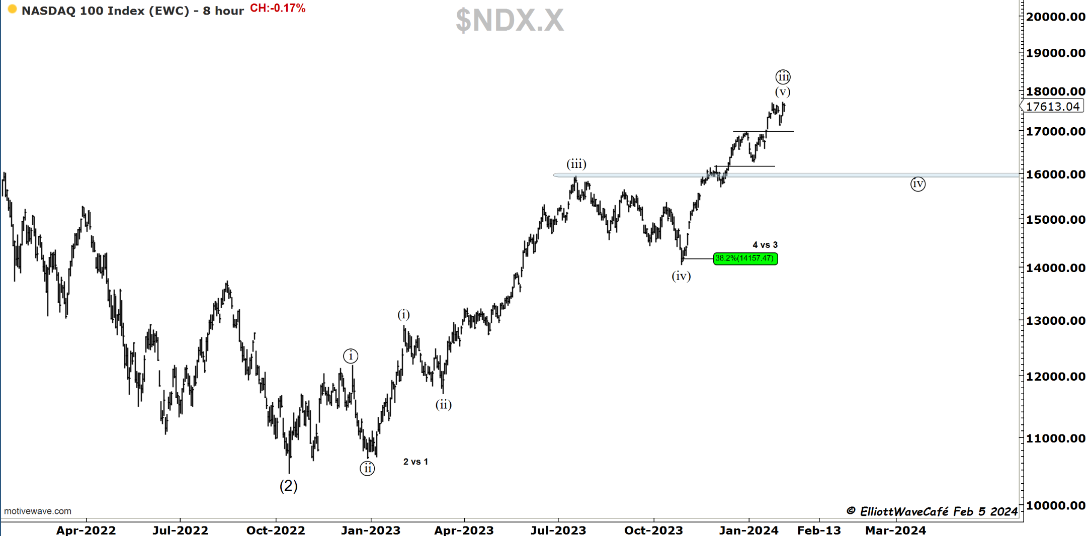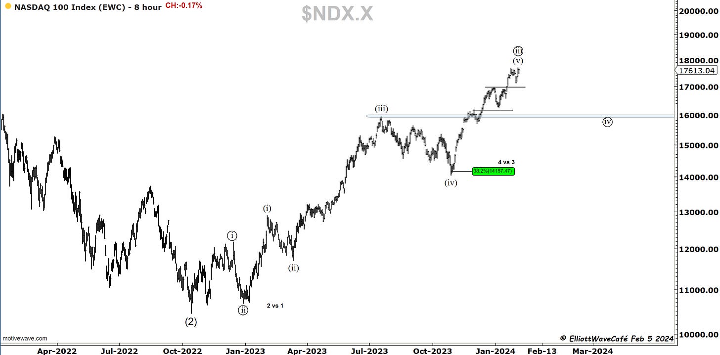 Dow continues to hold in a higher low tape, but it looks truly tired. If it loses 38,106, we can quickly see 37,800 where the stronger gates are. That wave (iv) stands out more and more as the correct labeling.
