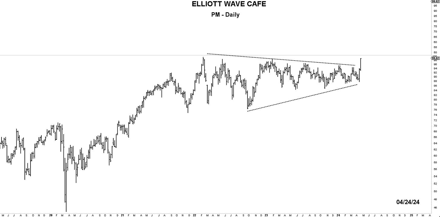 Chart of the Day—PM—Philip Morris is attempting to stage a breakout after more than two years of sideways corrective action. Have fun labeling this chart; it’s a good exercise. I will discuss it in tonight’s video.
