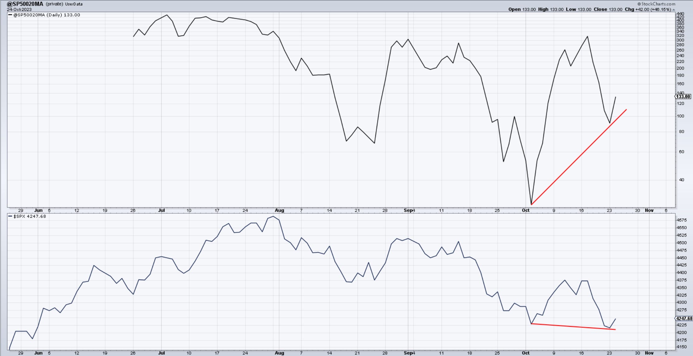 43 more stocks have managed to get above their 20-day MA today for a total of 133. That means that we still have 367 stocks below that line. The patient is still sick but appears to be recovering.