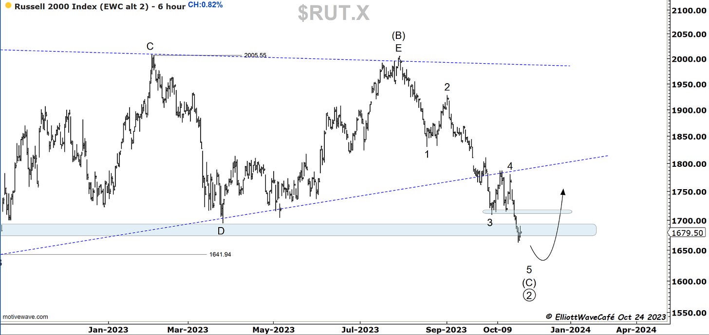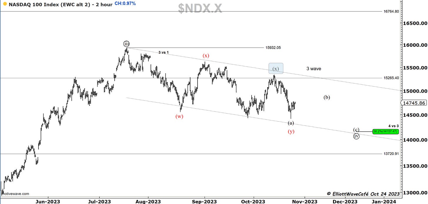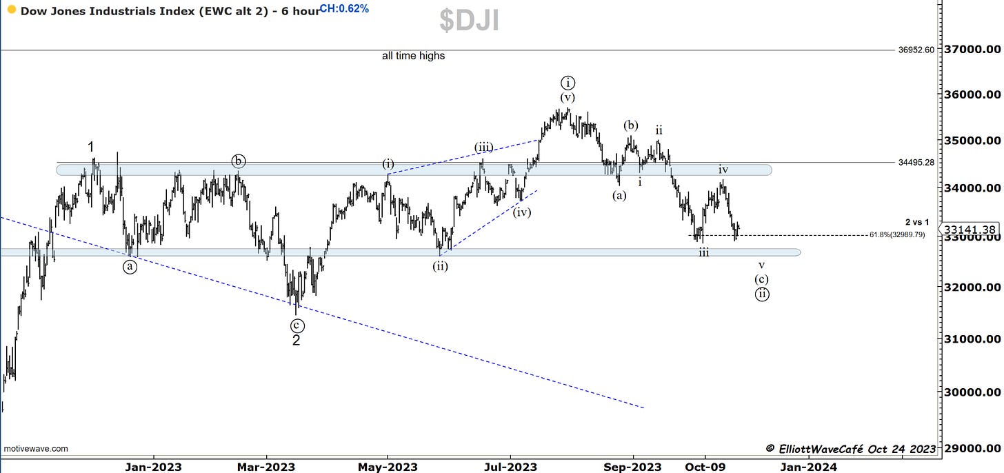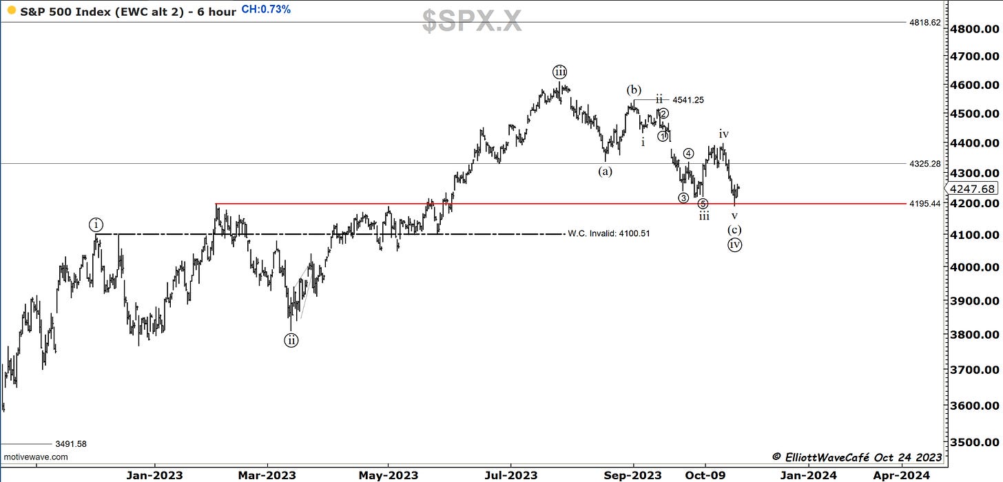 I have been looking in a bit more detail into the decline in the SP500 and there is a possibility that the latest drop was actually wave v of (c ) of ((iv)). If you look inside the internals of wave iii, it makes sense. So what appears to be a 5-wave decline it’s quite possibly 3 waves. I will track this besides the count presented yesterday. Remember the bear’s approach is a 1,2 1,2 here from July top, so they need a collapse in prices fairly rapidly. The longer this lingers the less validity that approach gets. A move above 4400 will make that bearish scenario quite difficult if not impossible.