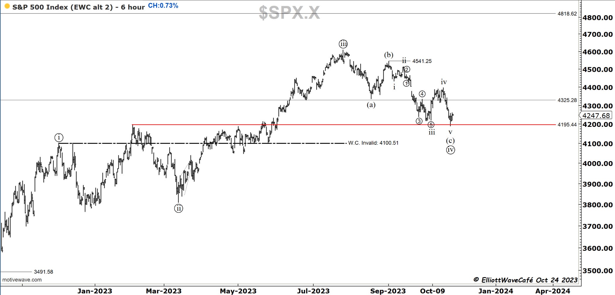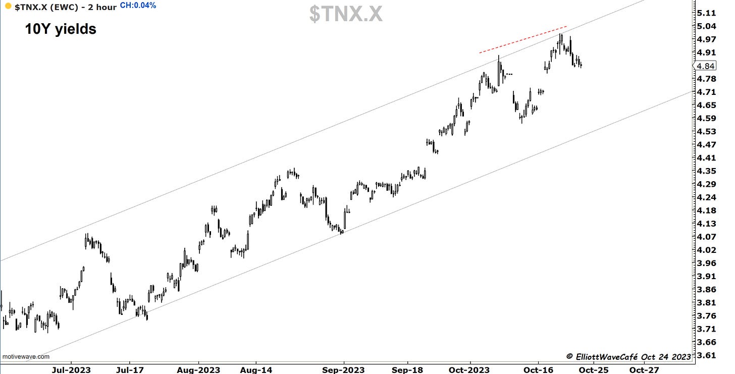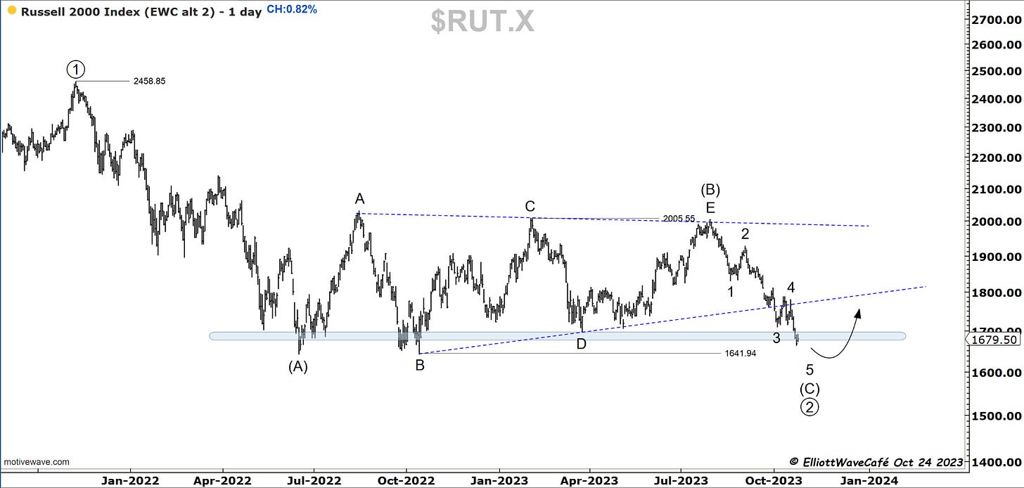 I have been looking in a bit more detail into the decline in the SP500 and there is a possibility that the latest drop was actually wave v of (c ) of ((iv)). If you look inside the internals of wave iii, it makes sense. So what appears to be a 5-wave decline it’s quite possibly 3 waves. I will track this besides the count presented yesterday. Remember the bear’s approach is a 1,2 1,2 here from July top, so they need a collapse in prices fairly rapidly. The longer this lingers the less validity that approach gets. A move above 4400 will make that bearish scenario quite difficult if not impossible.