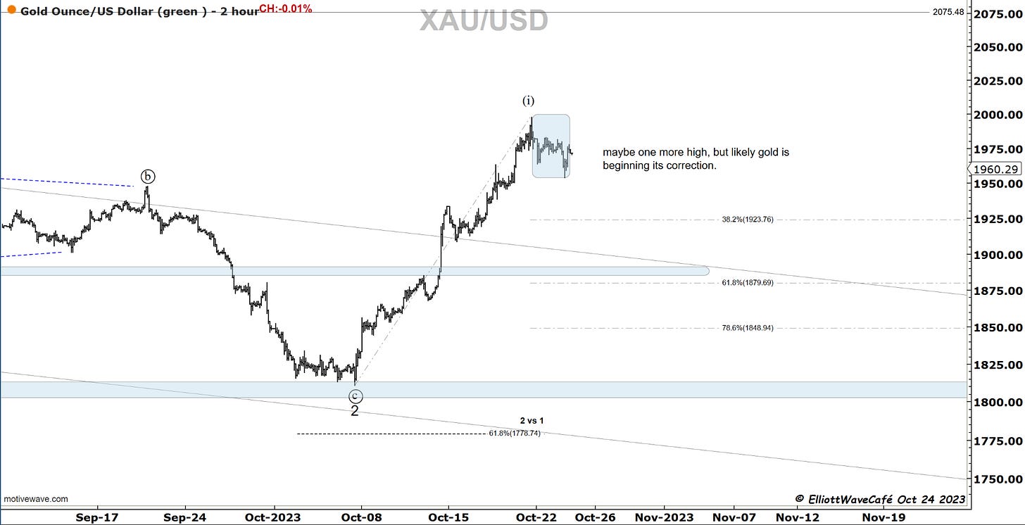 The move in Gold should be now complete and an appropriate fib correction should take place. Let’s start with 38% and see how that appears on the chart for a wave (ii). It looks like it front ran the dollar, so I am quite curious how it reacts if the dollar sells.