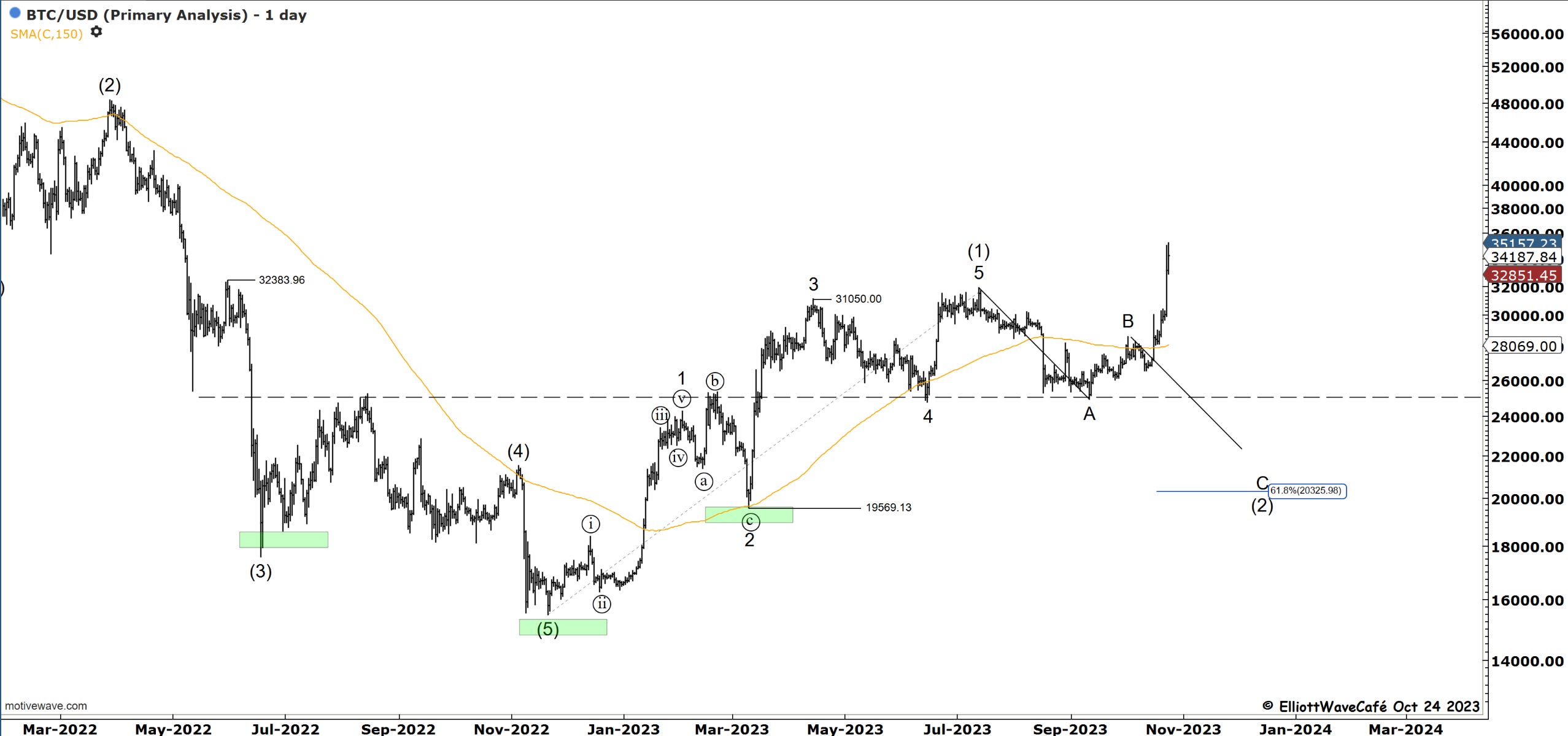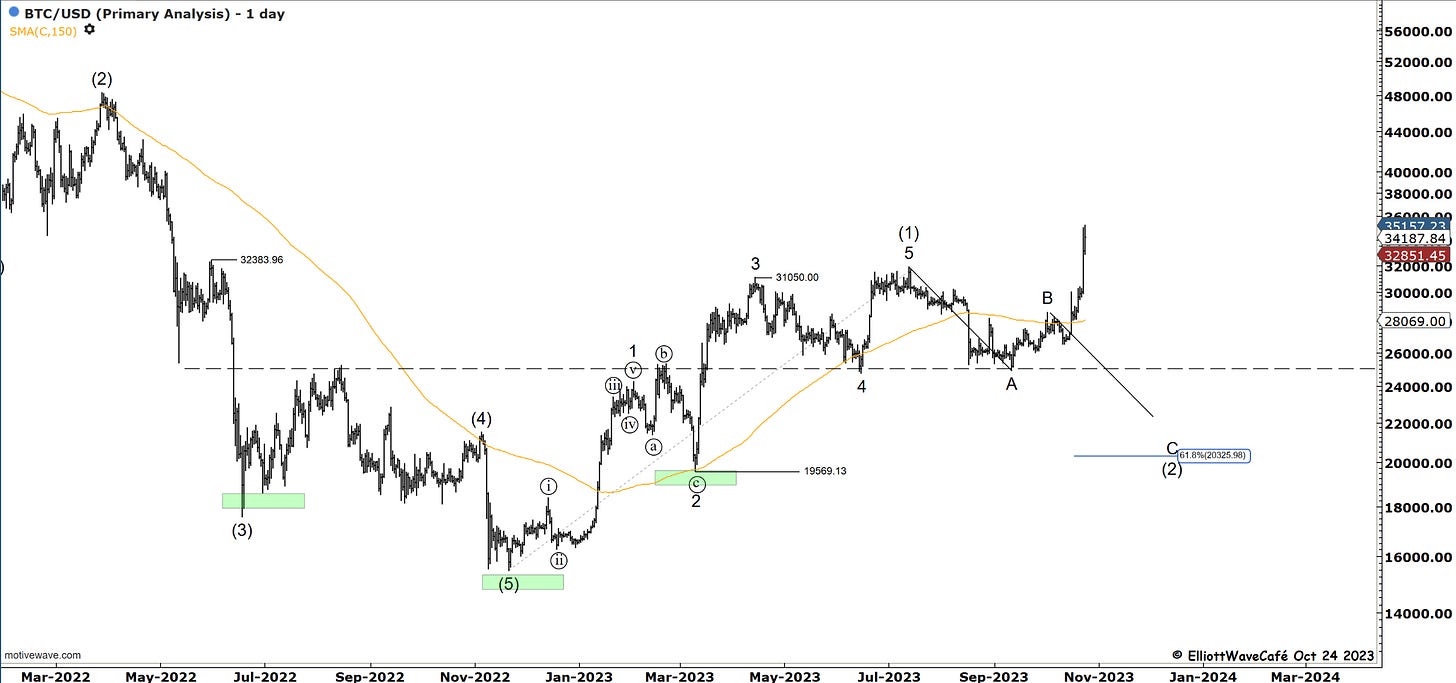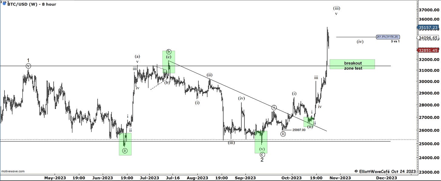 The rally in BTC extended to 35,150 just above the 261.8% multiple of wave (i). Wave (iii) might have one more push, but it’s reasonable now to expect a wave (iv) consolidation. I have labeled wave (iii) with an extended 5th wave in my view.