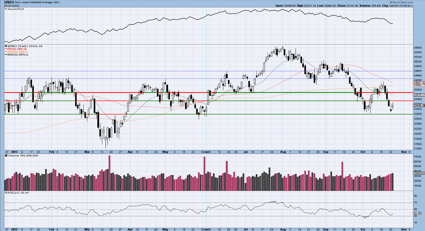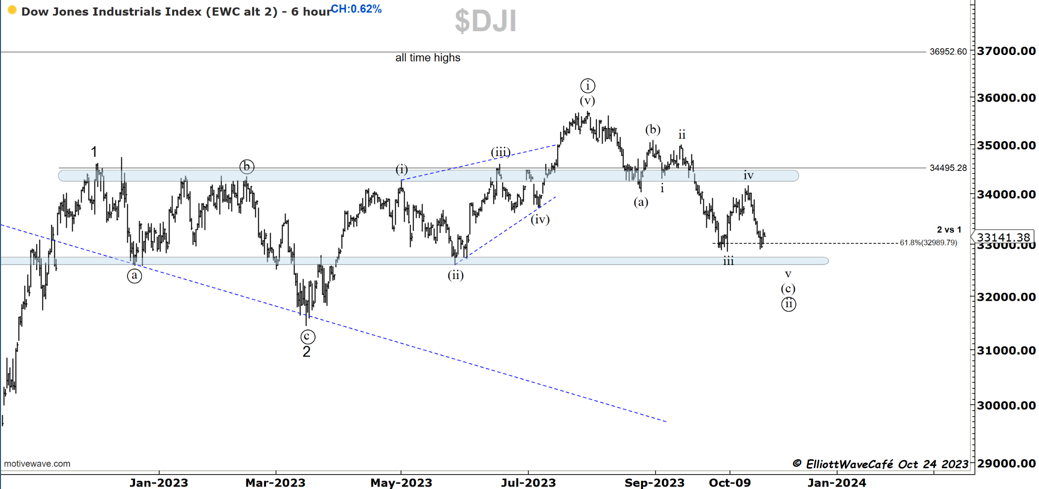Just like in the SP500, we can label this a 3-wave. Wave iii has the needed structure. Wave v will be truncated if we don’t stage one more low. The band of support below is obvious.
