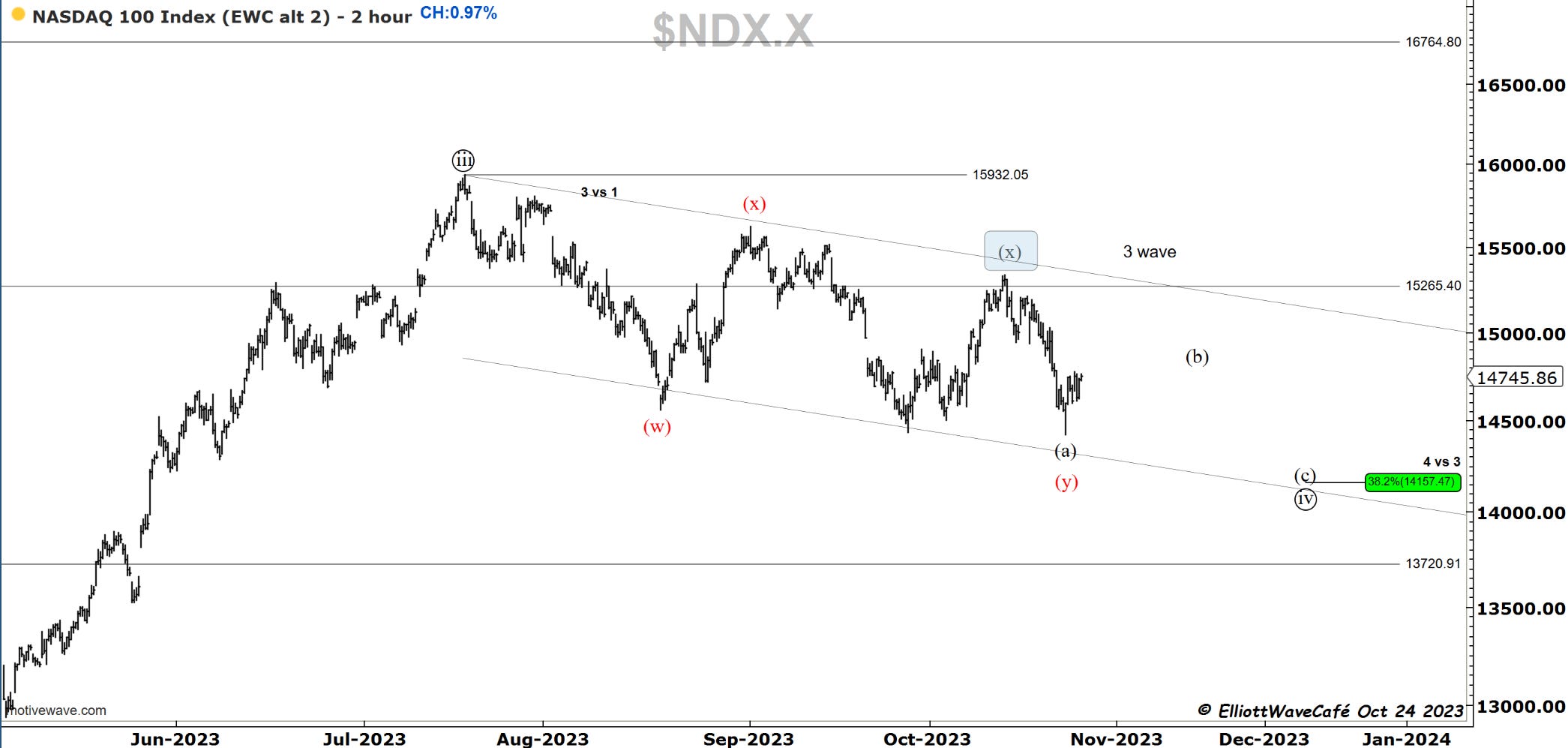 An almost +1% rally today in this index. The wxy in red is a possible alternate in case we manage to build up further gains, it just does not look very pretty. I have doubts on that one. A break of that upper trendline would have me secure that count.