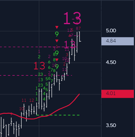 Yields were stable today and actually sold back after an initial rally attempt. Further failures here can help equities as well. The weekly and daily charts display 13 TD combo sell signals, showing exhaustion of buyers. Maybe Bill Ackman knows his technicals. Was 5% the top?