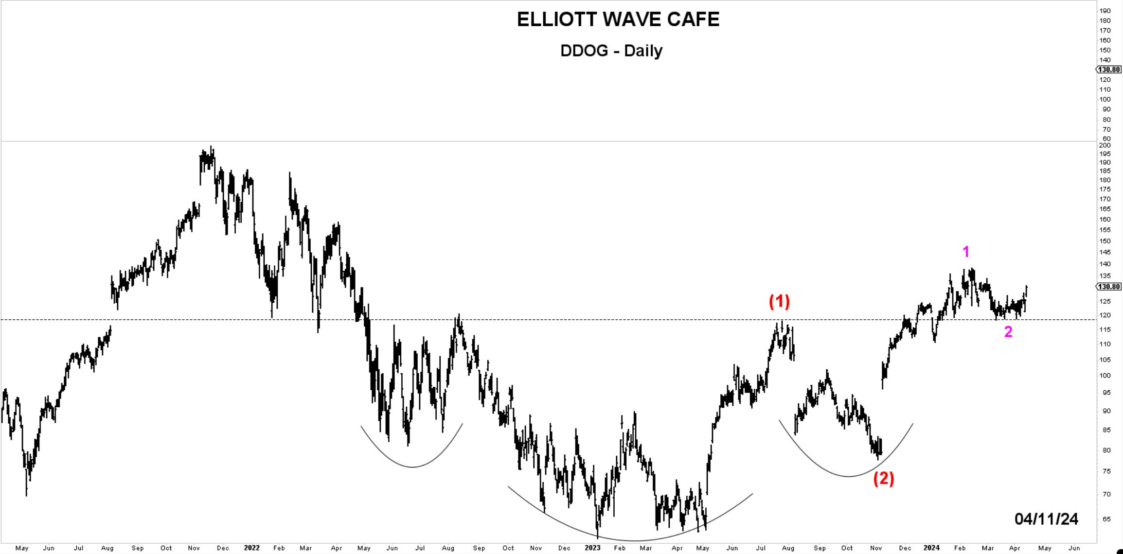 Chart of the Day—DDOG— The break above key resistance brings corrective action and a setup potential for a larger 3rd wave. Below 117, I would exit, give Wave 2 room to finish, and wait for the price to recover above 135 before re-entering.
