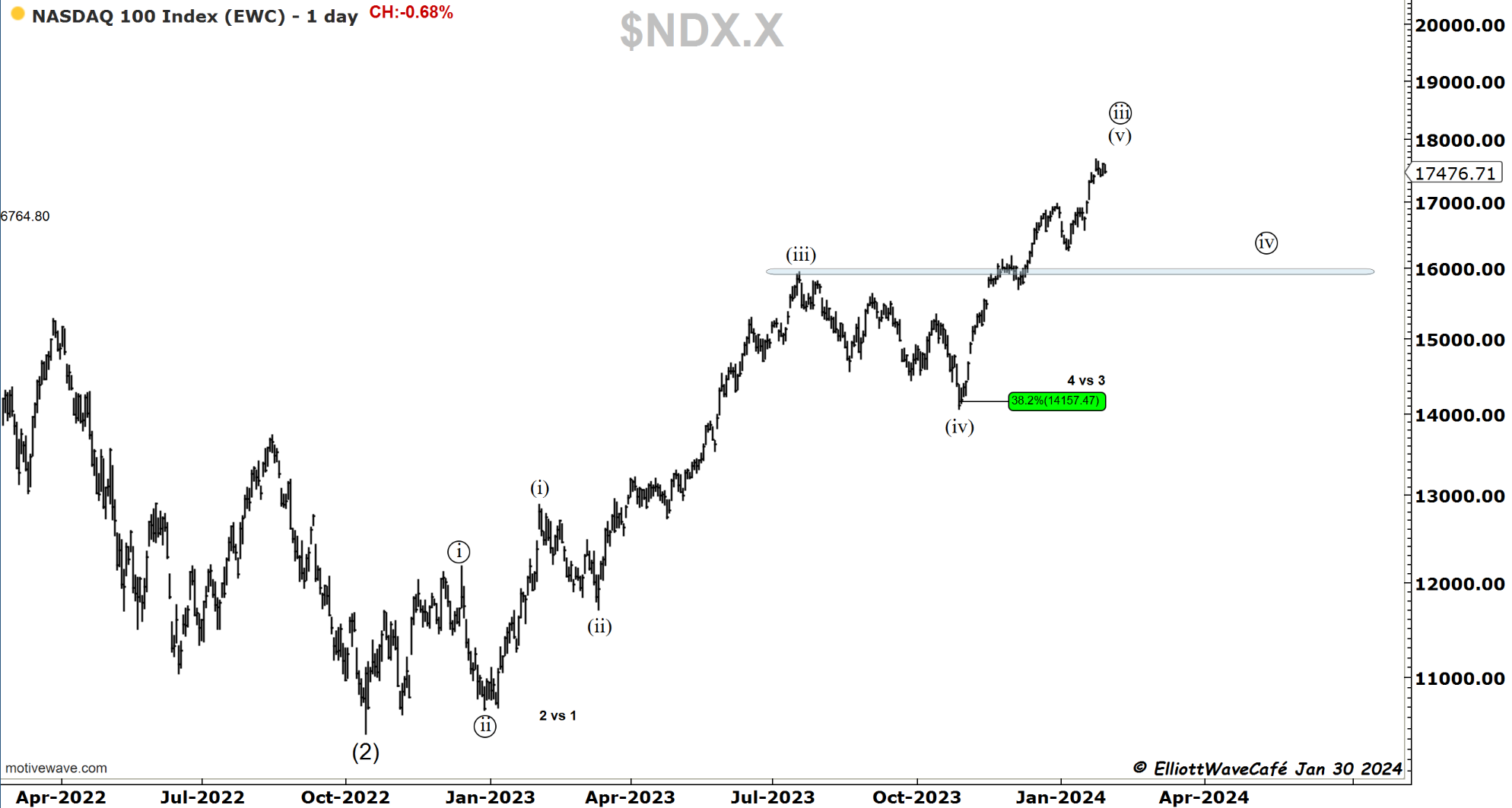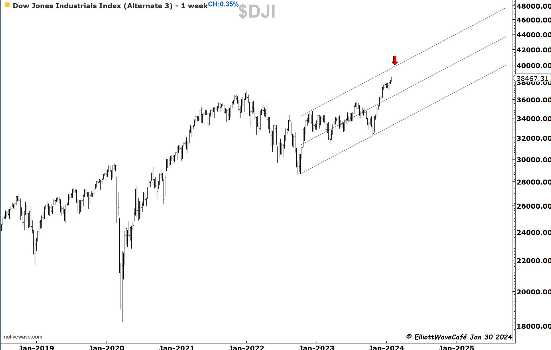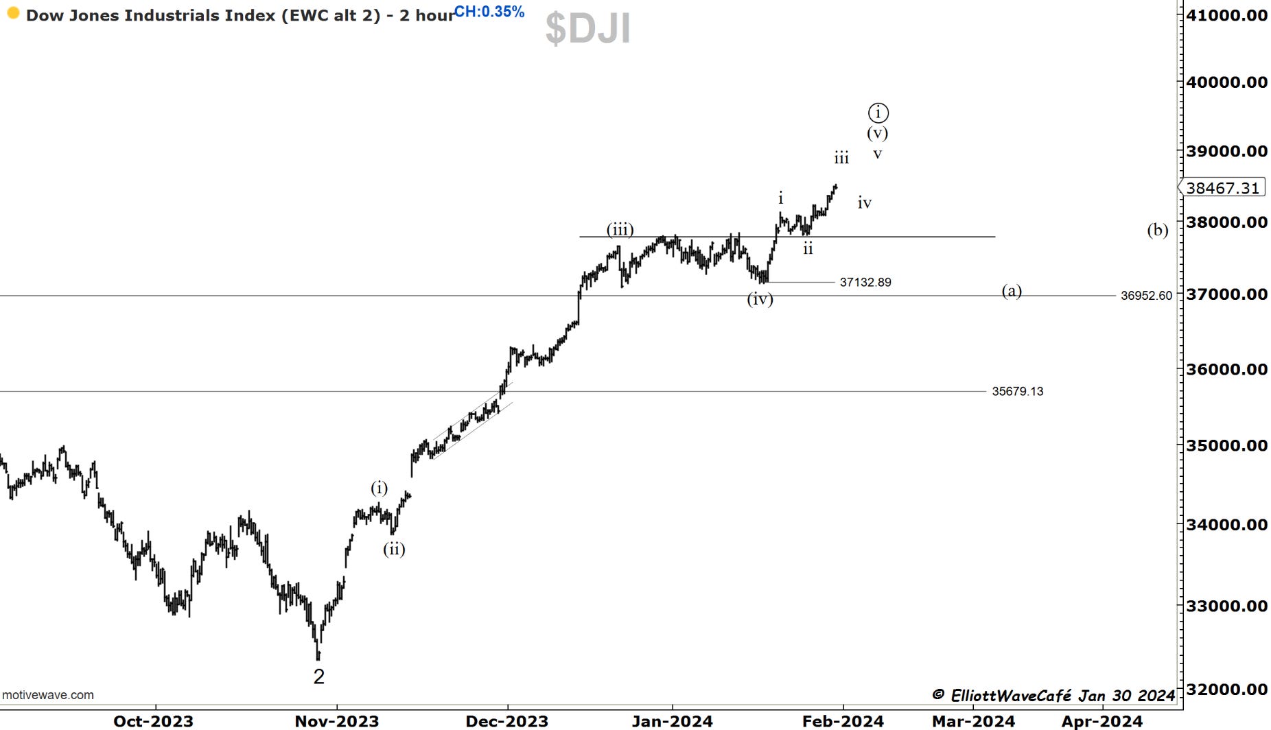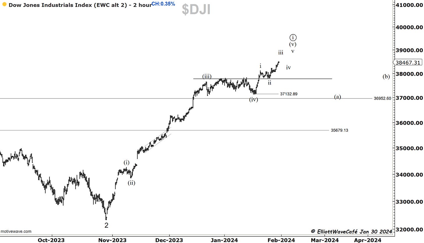 Dow continues to build on its strength and was helped to make a new high today by the performance in financials. Both the count and the channel below, suggest there should be a bit more upside here until we get to the next corrective phase. However, a break below 38k would hint at a top being found. Wave (a), when it starts, should take us to 37k.