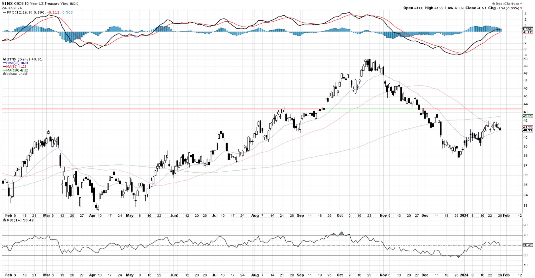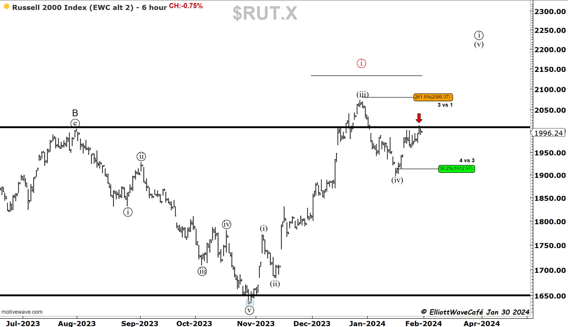 There are no further cracks upward in the small caps, which took a decent beating today. The red arrow shows the importance of that level, which extends all the way to August 2022. A break-back below 1900 would pretty much negate the wave (iv) theory.