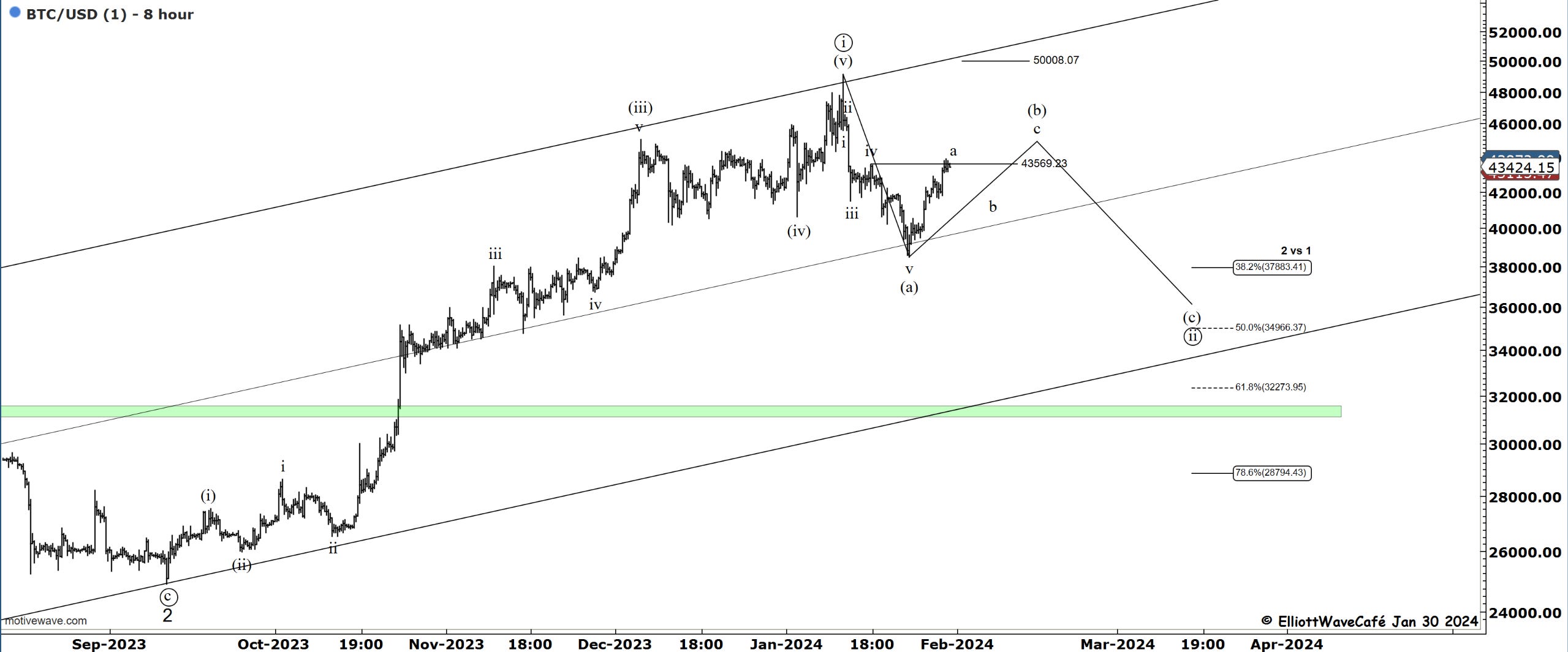 A simple way to take a short view on this would be to protect above 45k and look for a break below 38.5 with initial targets at 41k.