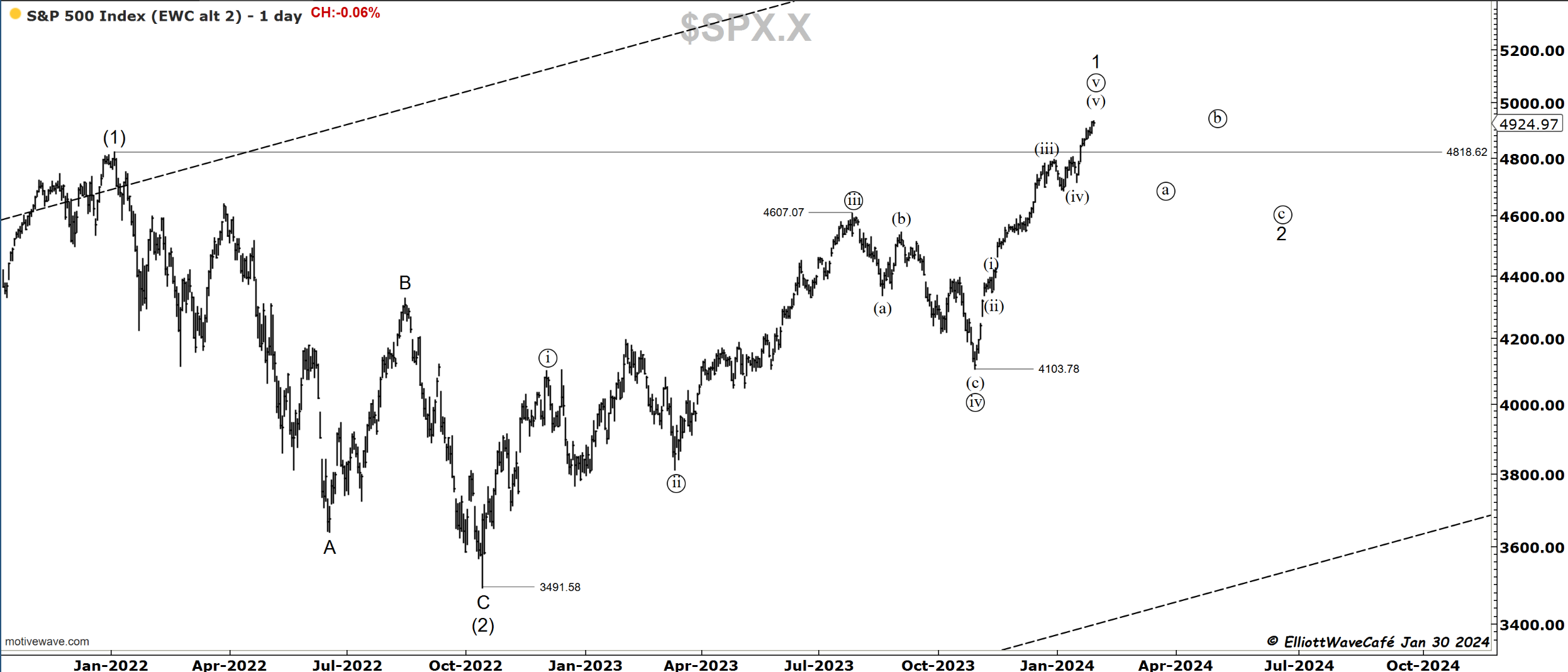 The market trod water for most of the day in anticipation of the upcoming heavy earnings from some of the largest cap names. Wall Sreet was not impressed with some of the numbers or guidance, and we’re selling off in the after-hours as I am writing this piece. In lieu of the Fed meeting tomorrow, I expect this to stabilize until Powell takes the stage at 2.30 PM EST. Some of these very large-cap names, especially in tech, had tremendous runs, so earnings have to be outstanding for these high prices to hold water. Anything subpar can create “sell the news” events. We add to that the final proposed stages of a wave (v), a weak seasonal period, and a topping cycle, and we have a decent cocktail of events that can start the corrective phase towards 4600. A break of 4800 would be a decent signal for such a scenario.