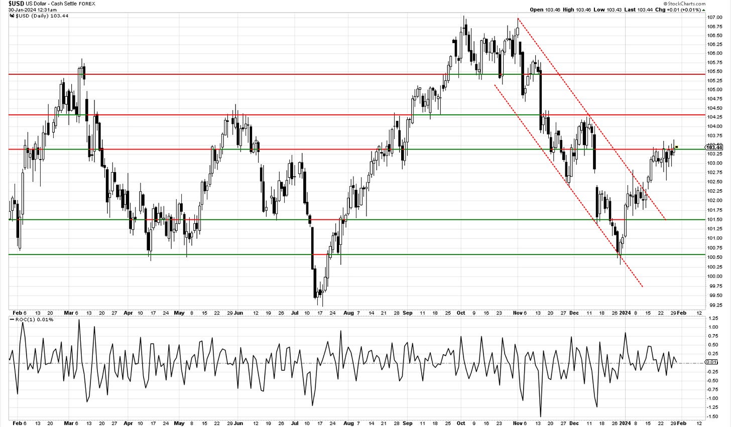 The dollar has yet to respond to the strength in equities, even with a slight decline in treasury yields. With the FED on Wednesday, these two markets are key. A break of 3.9% in the 10yr would suggest the 3-wave rally is over and new lows are coming. The dollar would follow I reckon along with risk continuing higher. Notice how the Greenback is fighting the old memory level near 103.30.