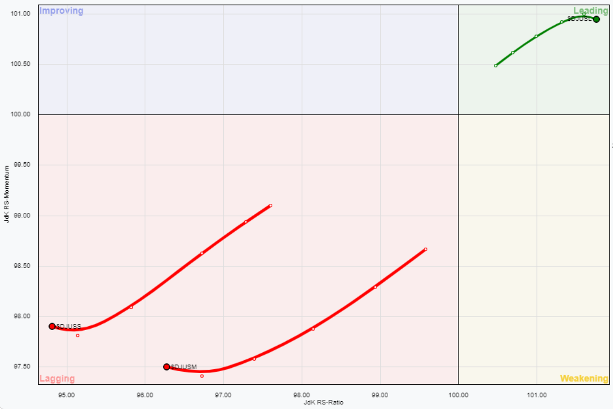I'm not sure how familiar you are with the relative rotation of assets, but the graph below shows the three main indexes in terms of size: large, mid, and small. It’s a monthly time frame. The large caps are leading and have been outperforming the main market for the past 2 years. This boat seems to be taking a small turn lower. The other two, small caps and midcaps, have been a disaster relative to the benchmark but seem to turn higher slightly. It is still premature, but I will monitor this for members throughout updates. Looking at absolute charts and relative graphs on multiple timeframes can help paint a clearer picture of how assets are getting in and out of favor.