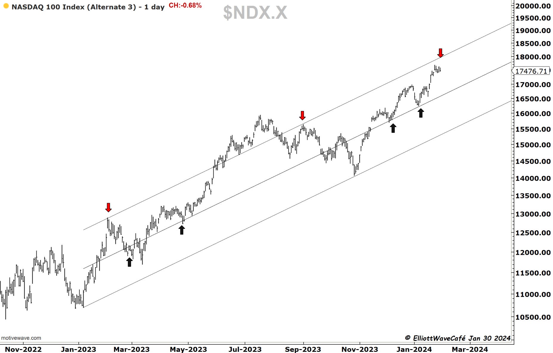 The Nasdaq channel is a bit wider, but the bottom line and the middle are keeping track of major swing points. Respecting the price hitting near the channel top is a must.
