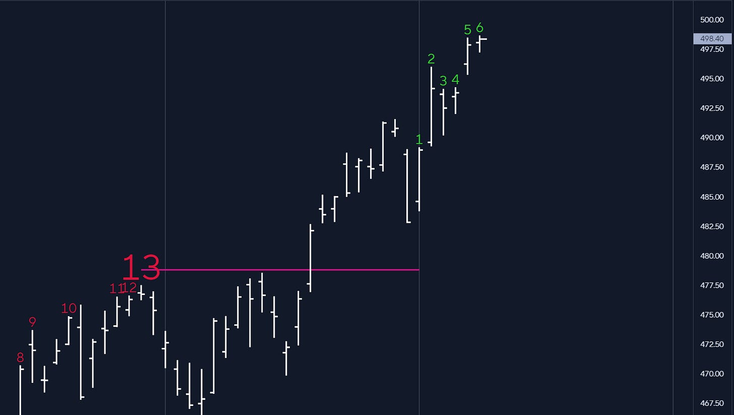 Today’s story is seen below. Small caps decided to shake the tree to see what had fallen. The market is pretty much unchanged on the three most followed indices. The tape is quiet and has no evidence of reversals. With all the “yellow signs” flashing and warning “caution” at these levels, until we see something appear in the price, one has to stay the course and assume a continuation of the status quo. DeMark counts below are still about 3 days away from flashing a sell setup 9 sequential.