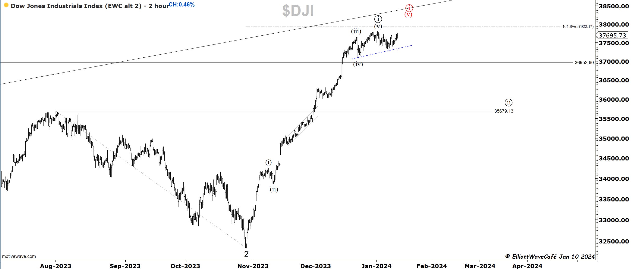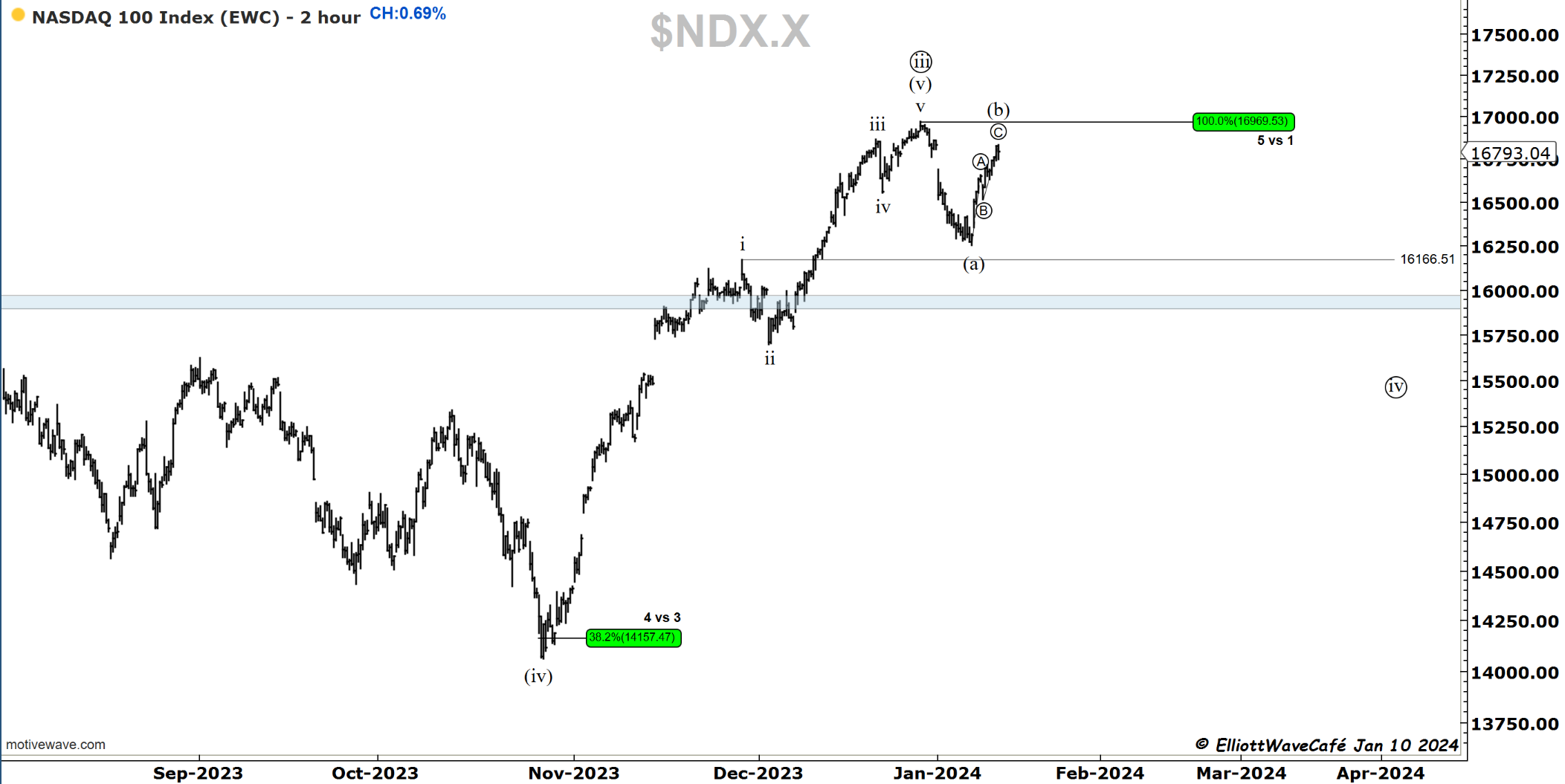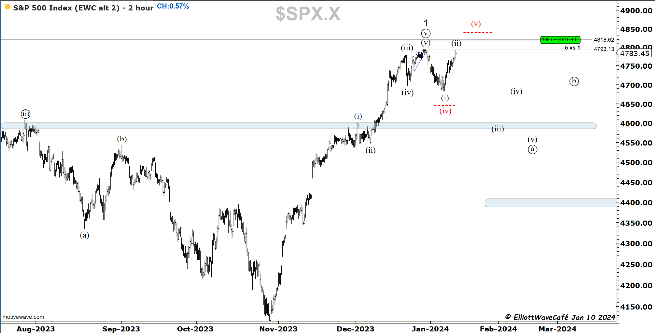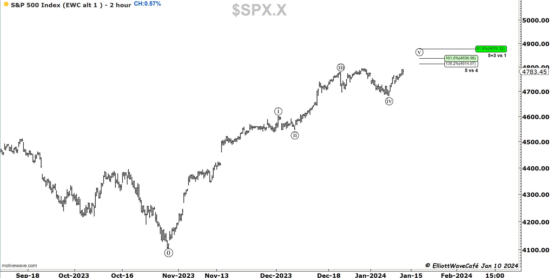 The session began on the timid side but accelerated higher as the day went on. We ended up near the end of Dec highs, putting my suggested count under pressure. As long as we stay below the top, the count is valid, but that does not make it a high confidence anymore. I have placed some alternate labels suggesting something I have discussed before. A larger wave (iv) with a (v) to come.
