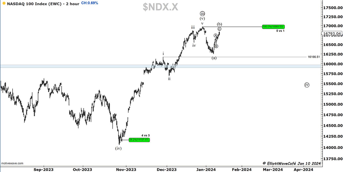 The Nasdaq rallied +0.69%. It is still below the Dec top, maintaining count validity. The move higher was sharp, but the three-wave structure remains. A new high will be labeled as a 5th wave, just like in the SP500. Below 16,500, the odds are that the corrective downtrend resumes.