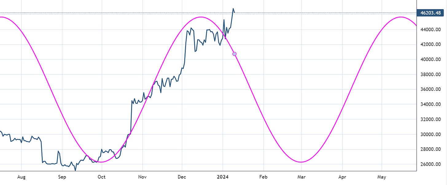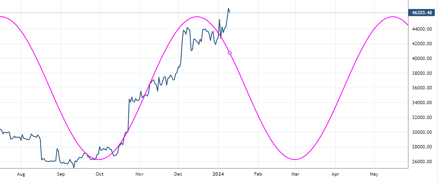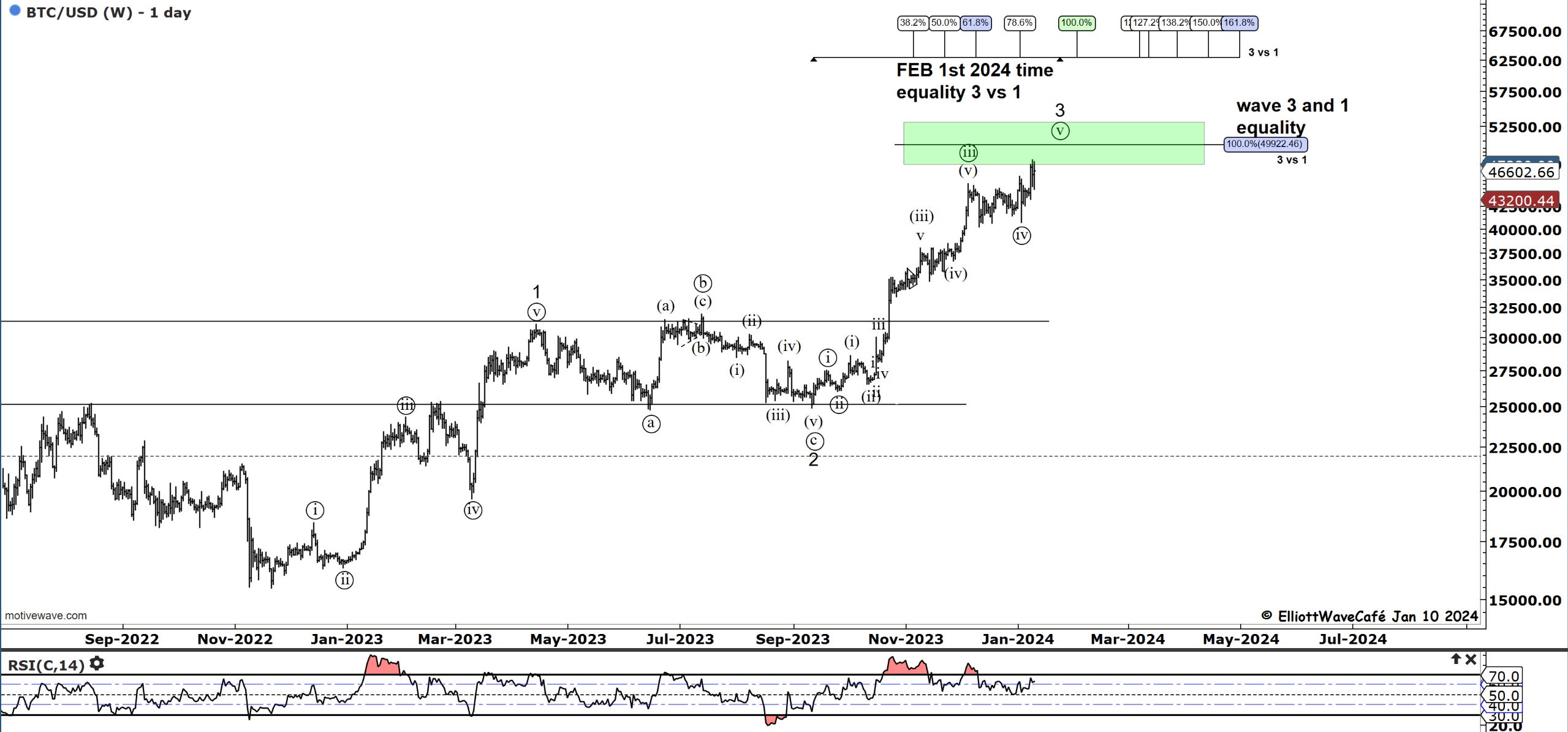 We will have a few Bitcoin ETFs starting to trade as early as tomorrow. BTC has yet to make any significant move higher as the time of this writing. I would be quite worried if it does not manage to get serious traction. A next-day “hangover” could very well be in the cards. If we manage to get there, 50k is a big level and coincides with wave equality seen in the second chart.