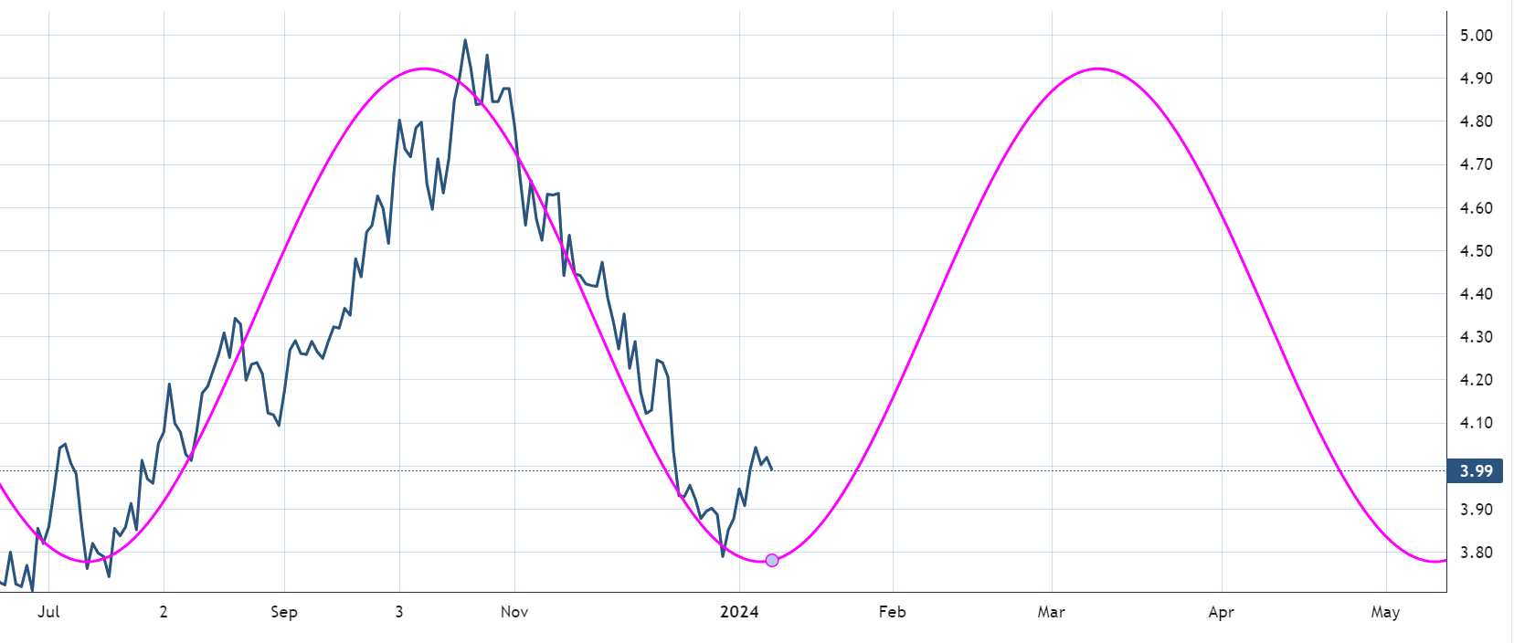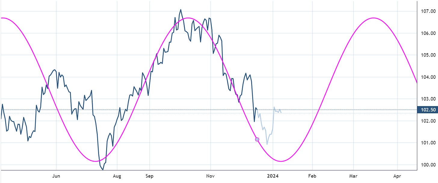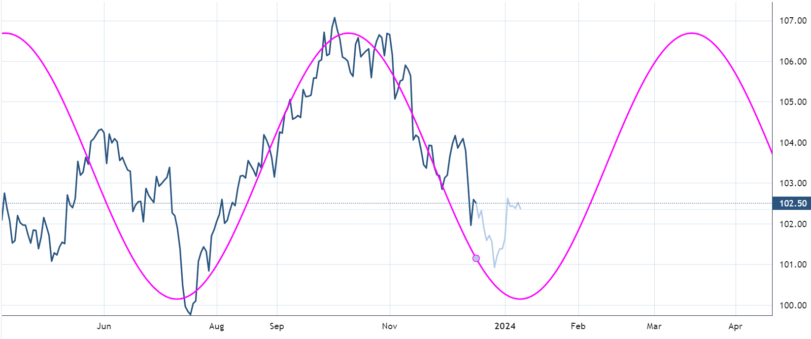 I looked at the Dollar cycle on Dec 18th; here we are, almost a month later. You can see the price action since then.