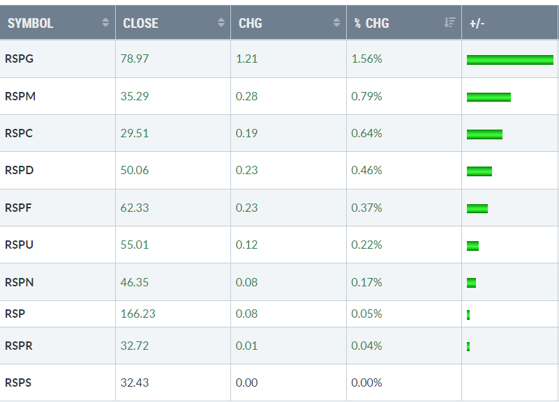 One way to analyze market breadth and participation is to look at the equal-weighted sectors and see how they behave in comparison with the tech, financial, and healthcare-heavy SP500. Today, 9 out of 11 sectors have outperformed the RSP (ew sp500).