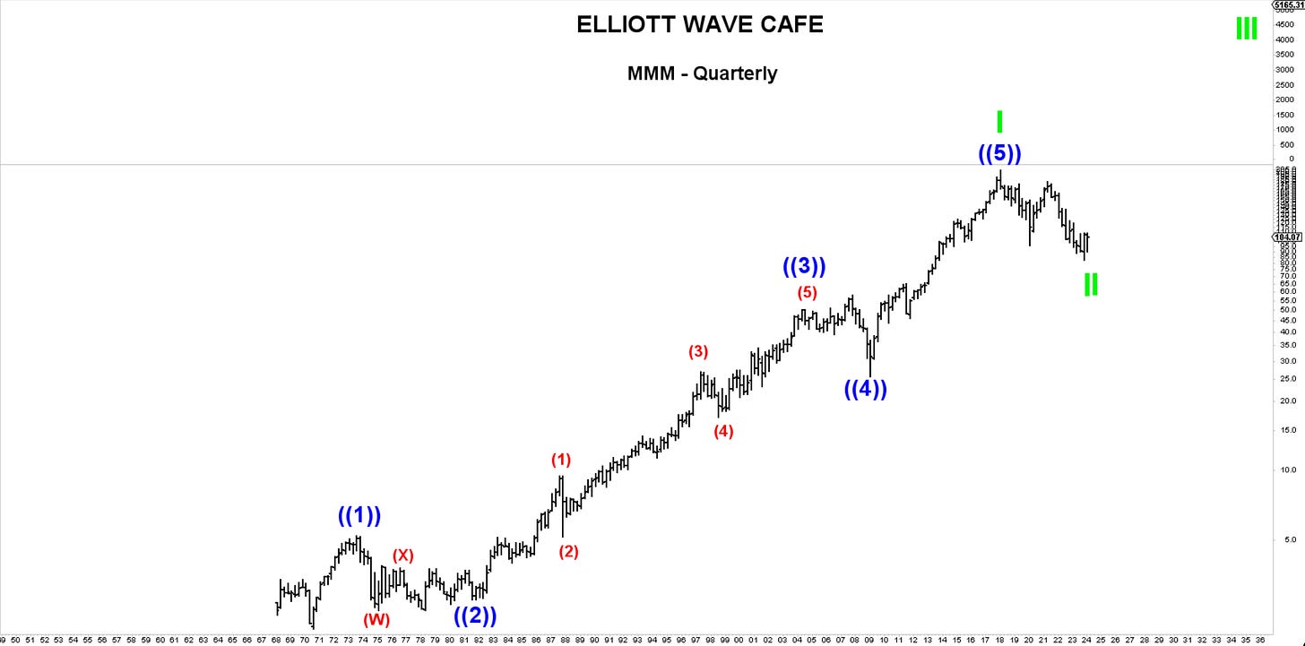 Chart of the Day—MMM—A rare display and analysis of a quarterly chart shows the beautiful wave sequences in this stock. Wave ((2)) is also quite rare (w) (x) and triangle in (y). Since we have a log scale and this stock has corrected 61.8% arithmetic from its low in the 1970s, I am labeling the current decline as wave cycle II. This should be followed by the next wave higher in III over the years, decades ahead.
