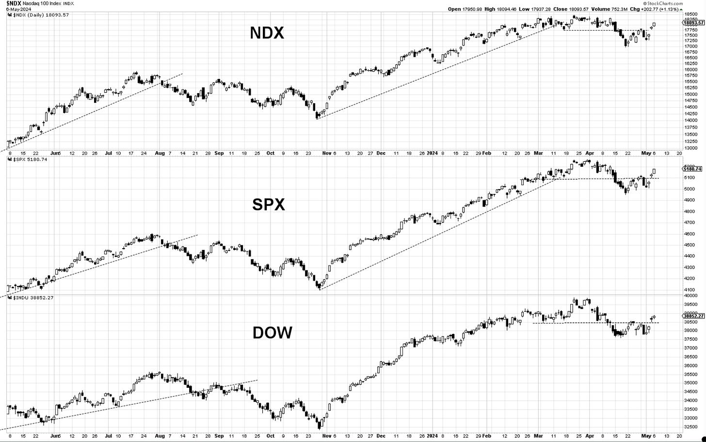 Bottom Line: Markets climbed back above dotted resistance levels. The uptrend is trying to reassert itself. As mentioned in the weekly update, increasing equity exposure is starting to make sense on the hunt for new ATH. The bears were unable to recapture the important bearish trigger from the April 25th lows.