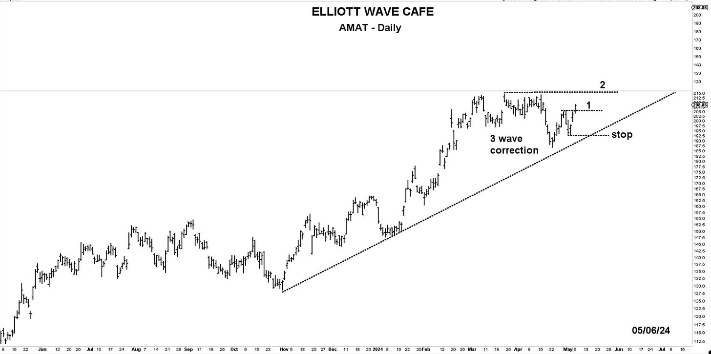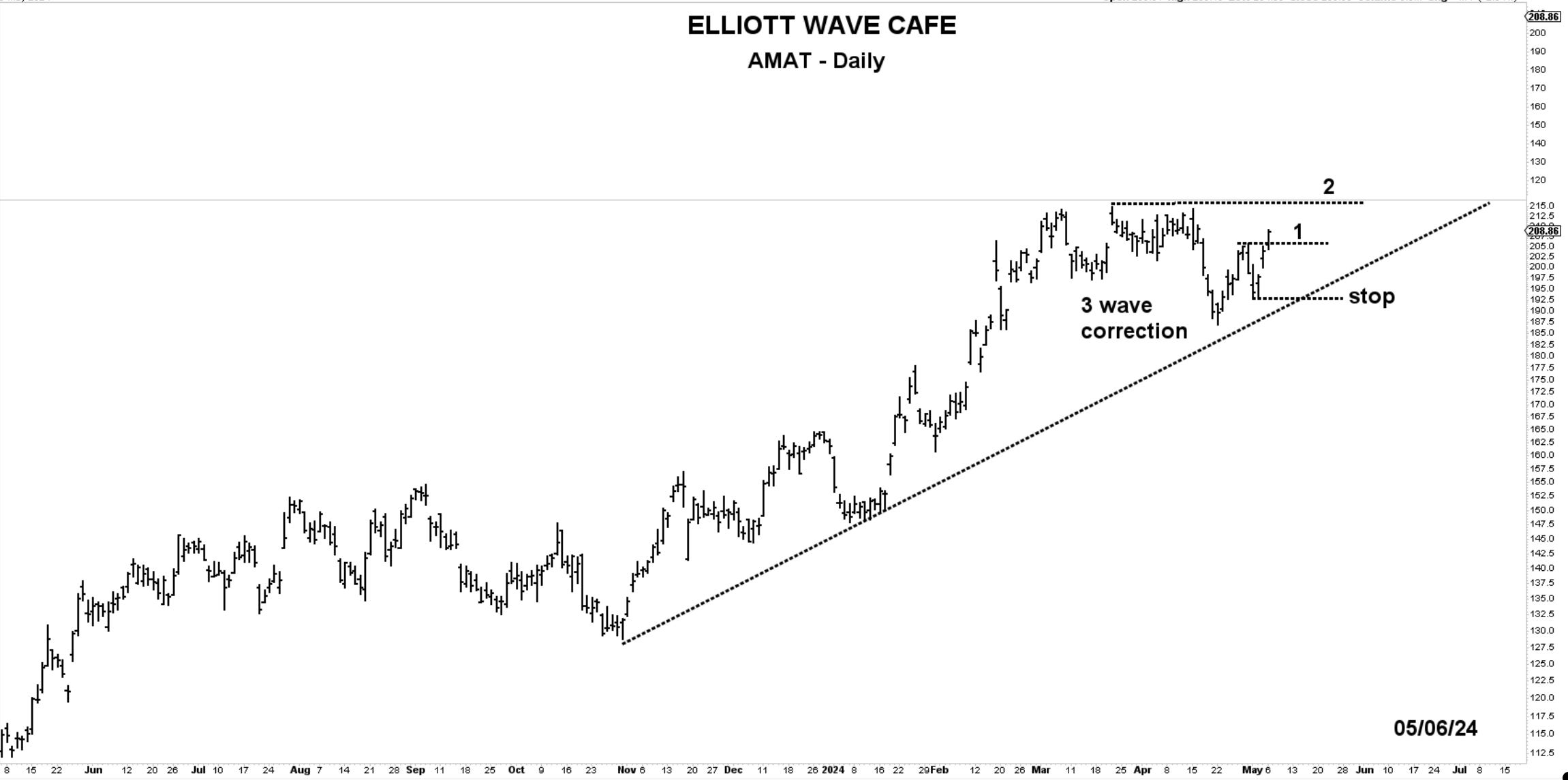 Chart of the Day—AMAT- The uptrend is in place, and the stock is coming back from lows and breaking above key averages. Entry points are 1(small) and 2 (add).