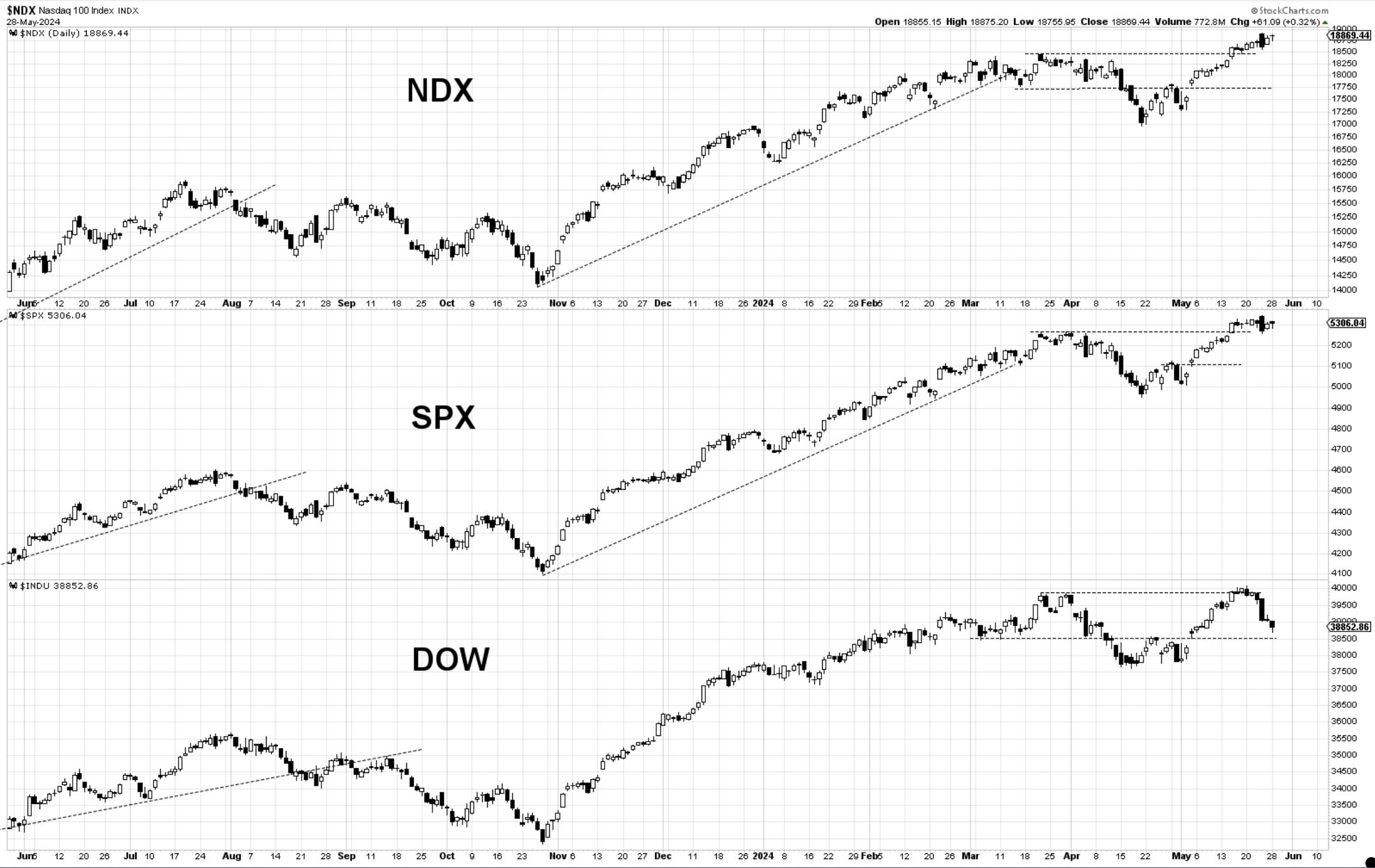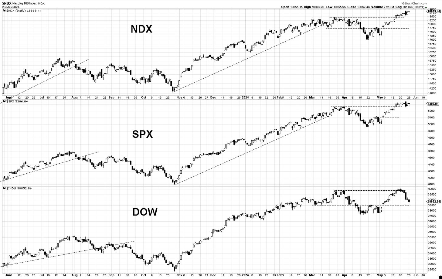 Bottom Line: The Dow’s divergence rings a slight alarm, with prices hitting support. The tech-heavy Nasdaq continues its upward trend, while the SP500 remains quiet after the outside day candle last Thursday. There has been not enough change in market character to warrant a serious reduction of long exposure.