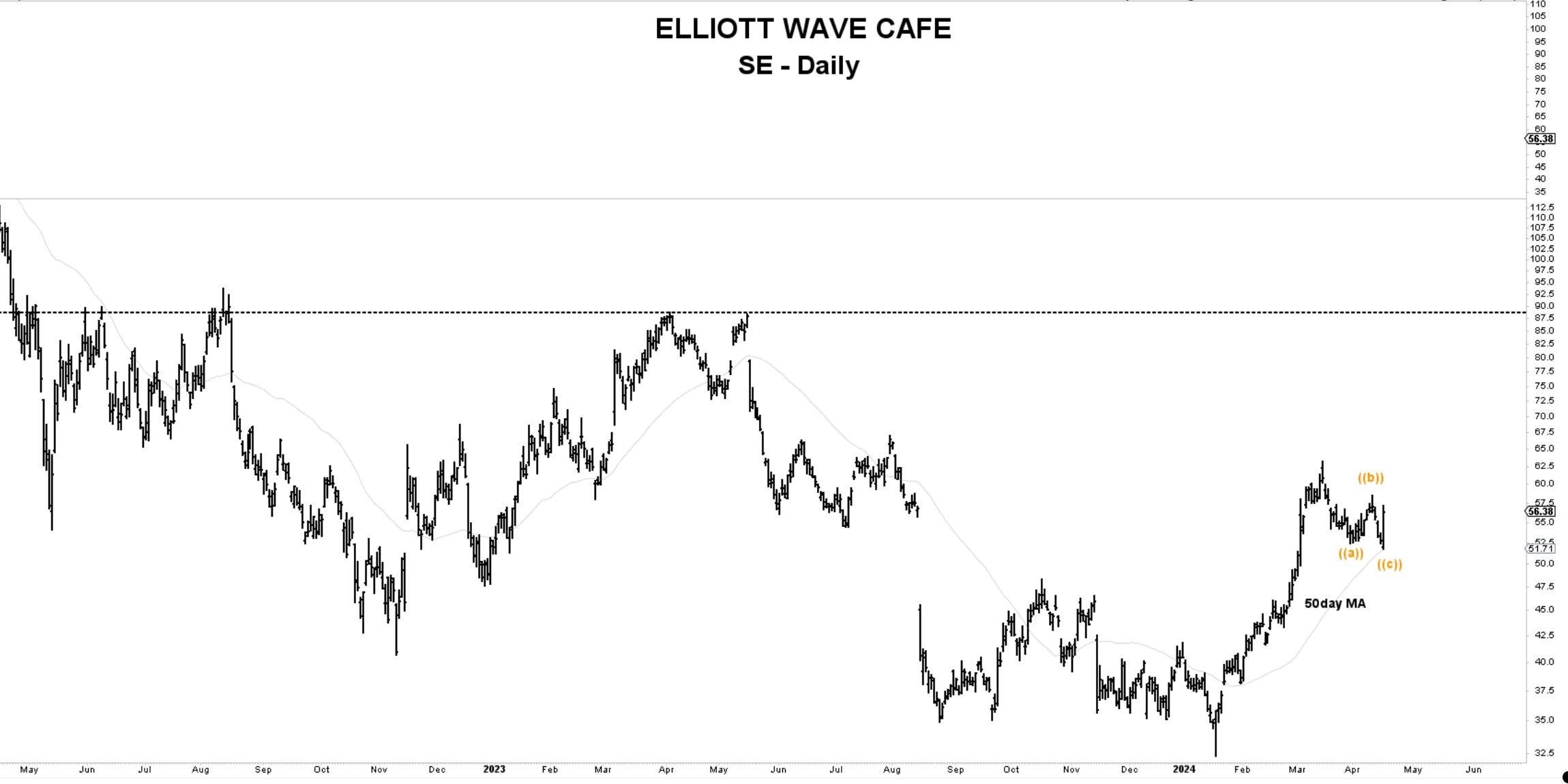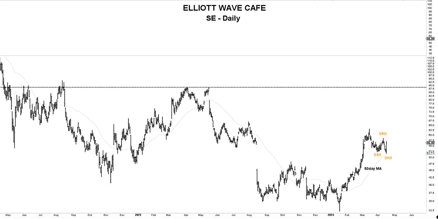 Chart of the Day—SE— Sea Limited here with what appears to be an ABC pullback to 50day MA. A setup I do not dislike as long as it breaks 58.70 first. A reversal below the wave ((c )) low changes the count and nullifies the current assumption.