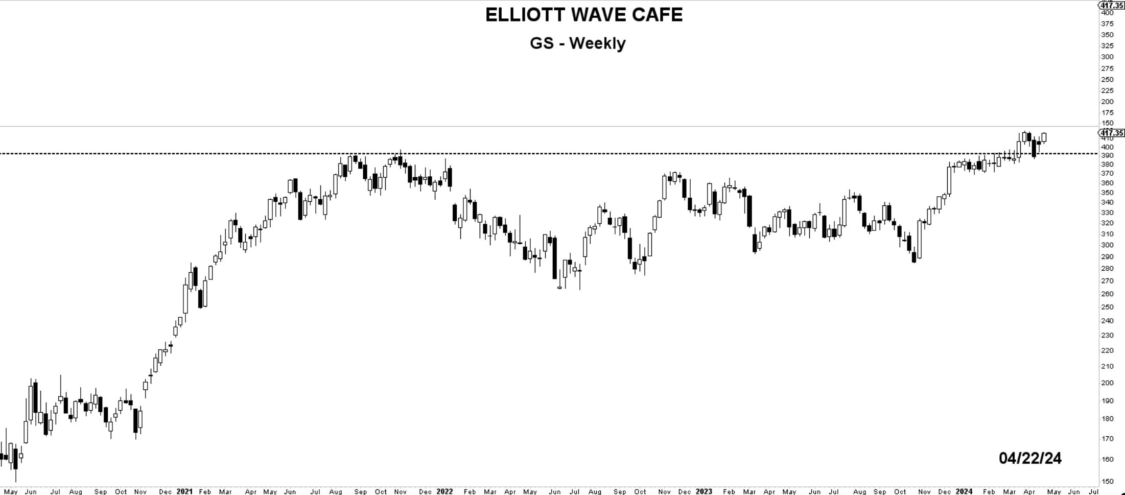 Chart of the Day—GS—Stocks that display absolute and relative strength during equities market corrections tend to be good performers going forward. Here is Goldman Sachs with a break and hold above the 390 resistance level. Using that level as a defense on a weekly closing basis, the path higher seems a sensible choice at the current juncture.