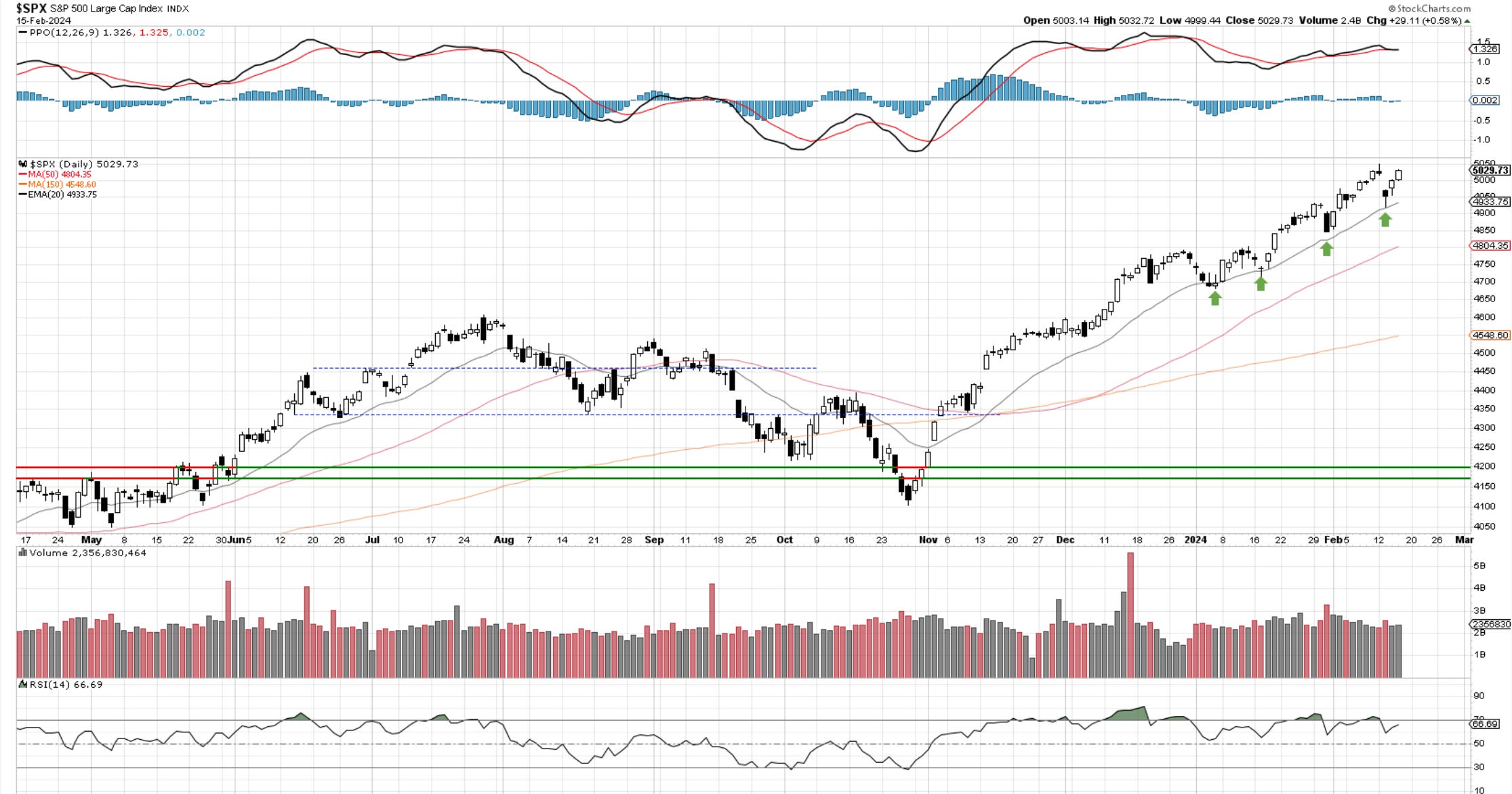 The 20-day MA continues to offer support and entry opportunities as the market trends higher. A close below it would hint at the start of a correction.