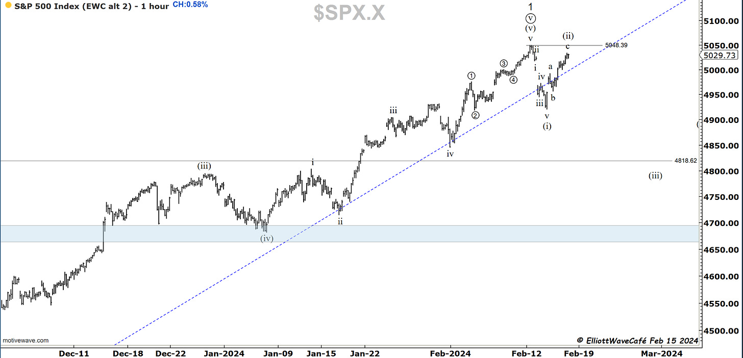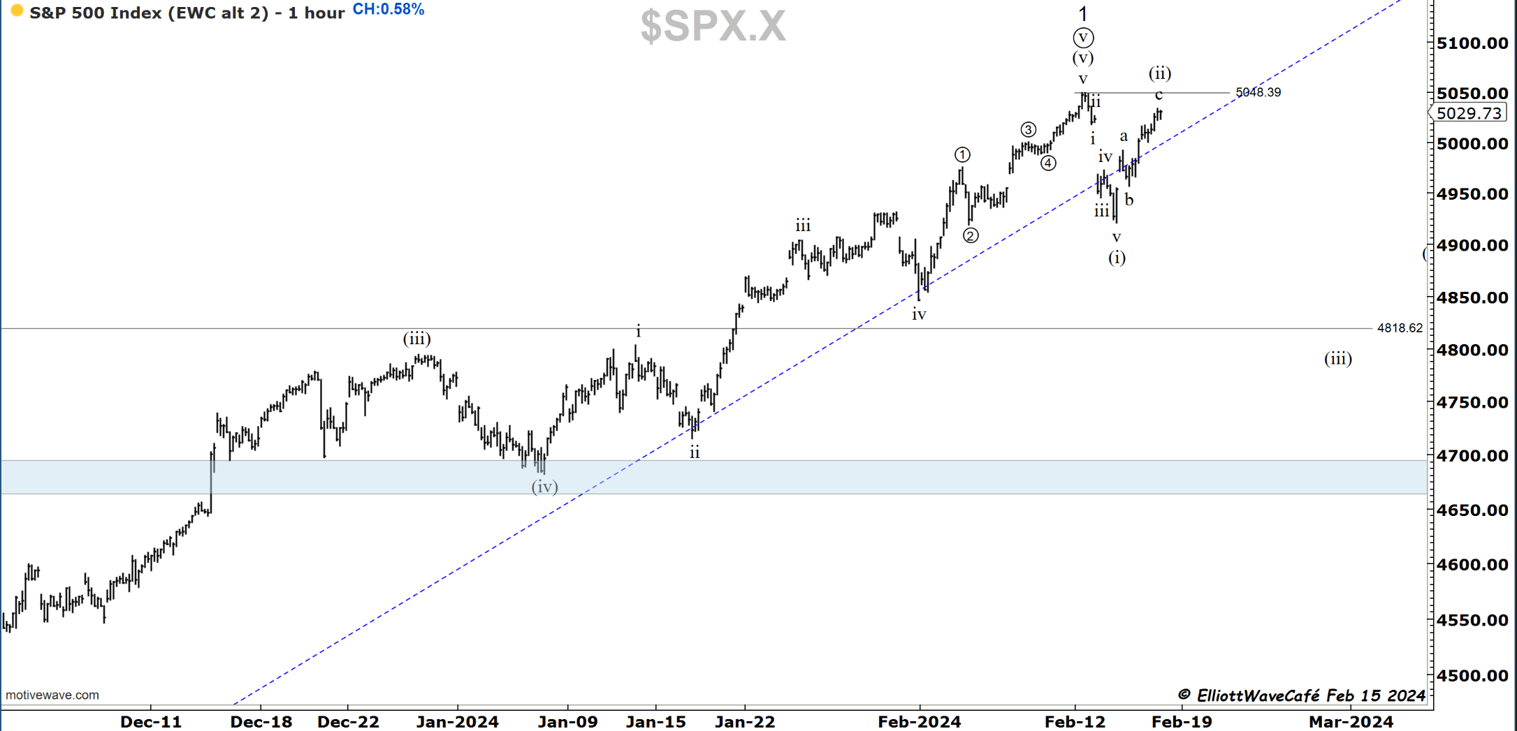 Wave (ii) is in jeopardy but correct assumption until we get above 5048 mark. The market has enjoyed expanded breadth today, even with some of the large-cap names under pressure. Tomorrow is the monthly option expiration; expect volatility to increase.