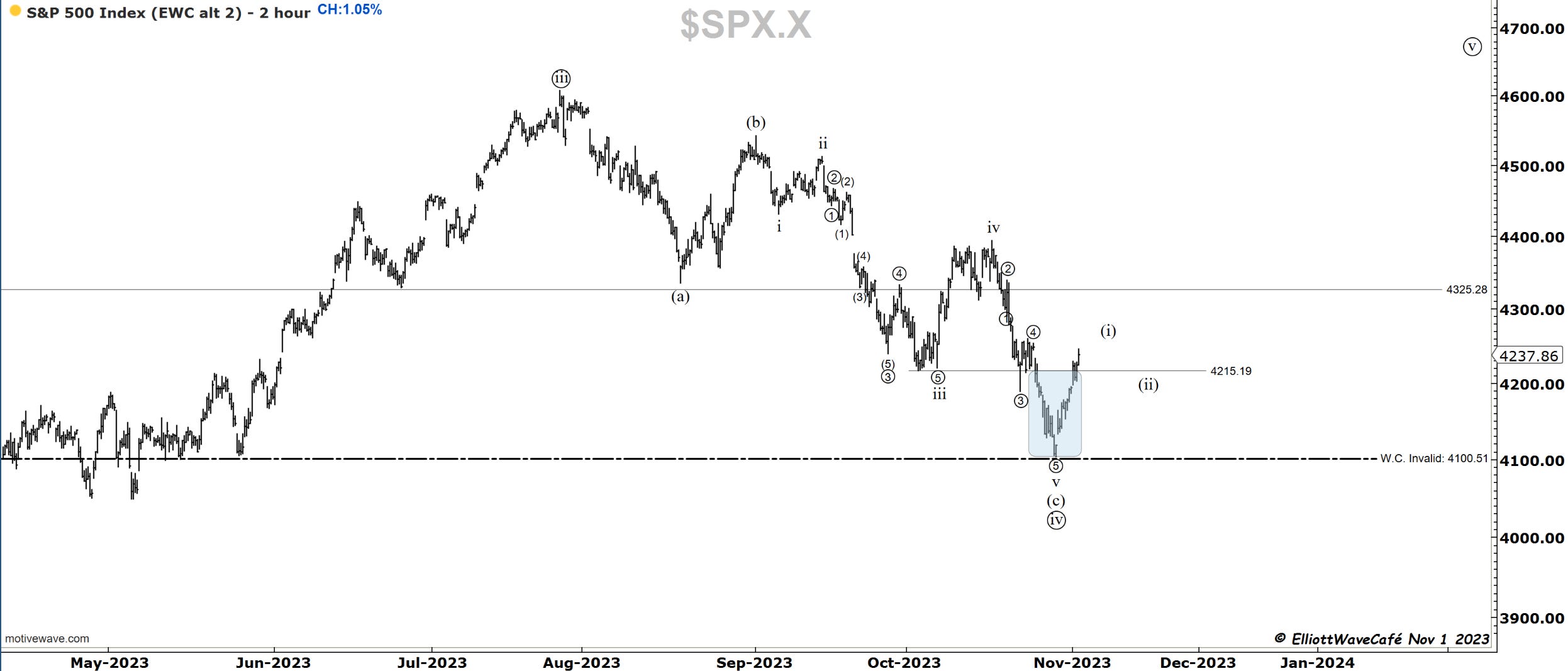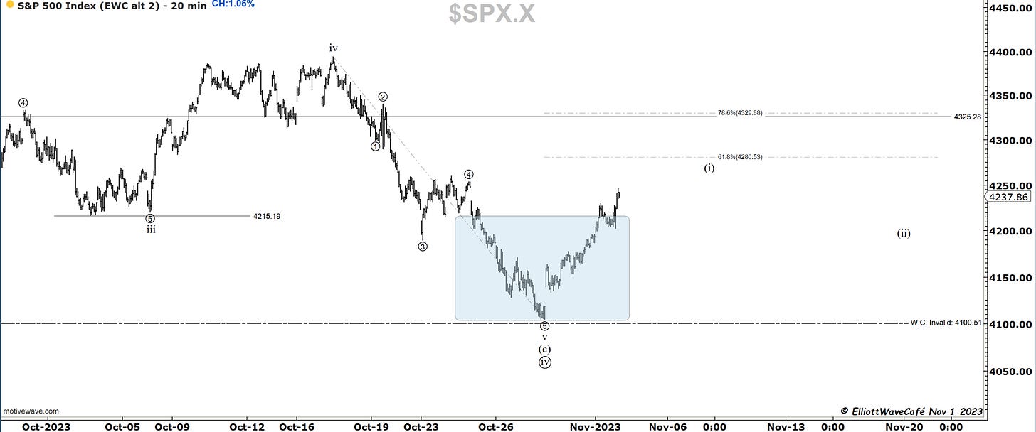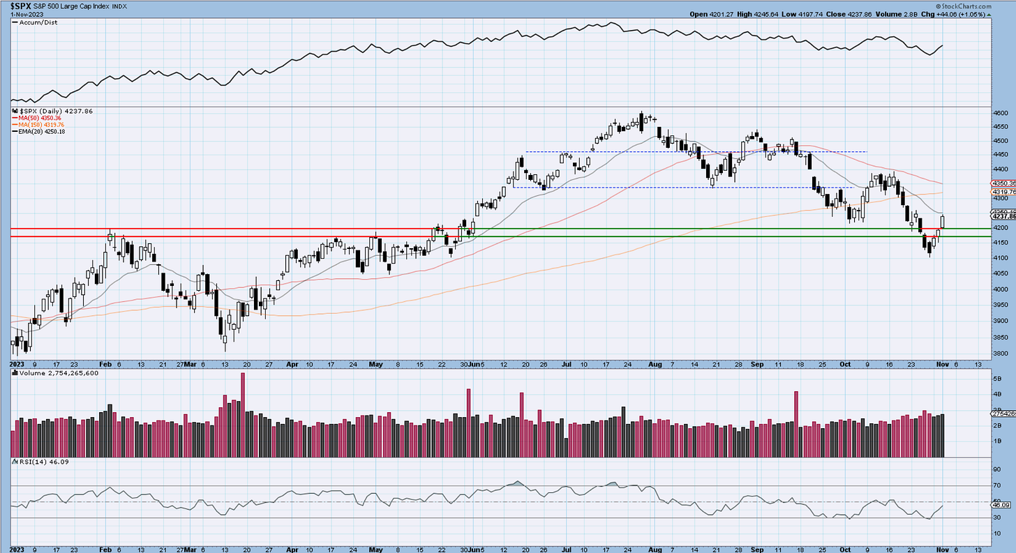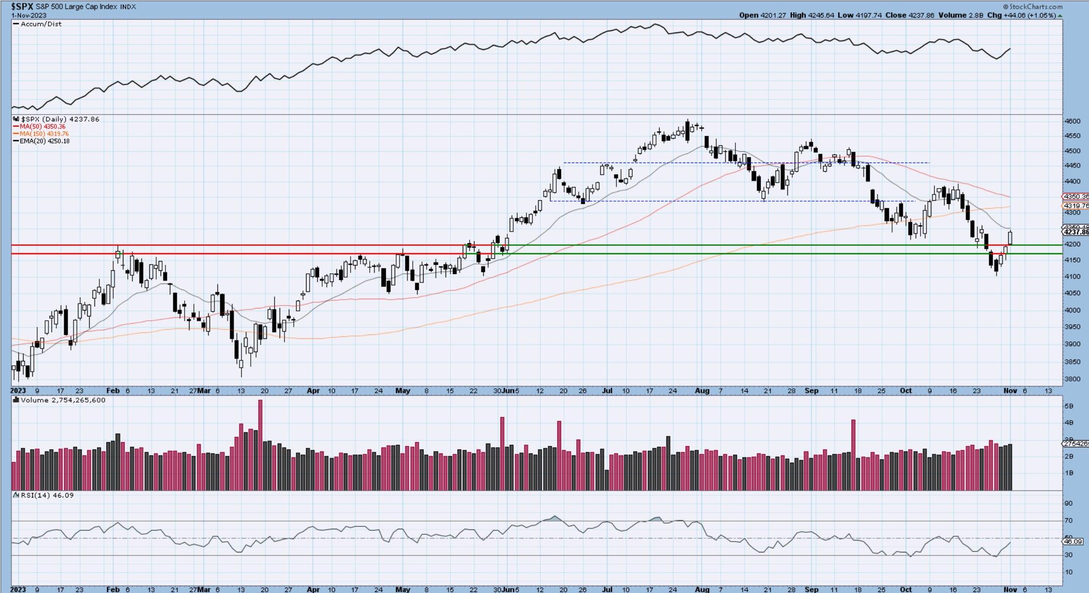 Three consecutive days of bullish price action in the equities. This comes on the hills of a three prior months decline with over-elevated fears of breakdowns on Friday, Oct 27th. The quick trip below 4200 and into 4100 was reversed at the start of the most bullish period of the year historically. Today’s Fed meeting accelerated the buying after a midday selloff prior to and at times during the press conference. Apparently, the market took Powell’s comments between the lines that the rate hiking cycle is complete and will eventually be followed by cuts if there is an economic slowdown next year. I can’t speak to how accurate that is, but what I can speak to is the fact that the signs I have been pointing to for several days now have proven to be important in terms of breadth, volatility, counts, sentiment, and seasonality.