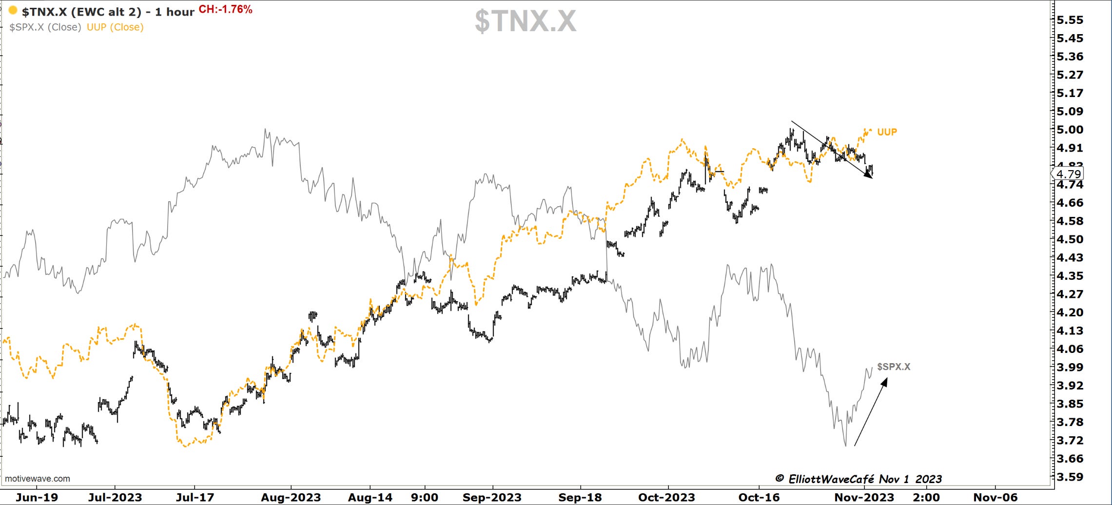 Yields had a big drop today after the Fed “hinted” at cycle over. Stocks up makes sense, but the dollar did not get the full memo yet. The yellow line diverging still.