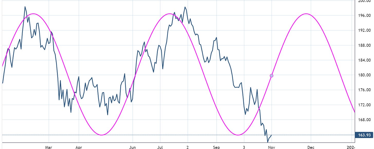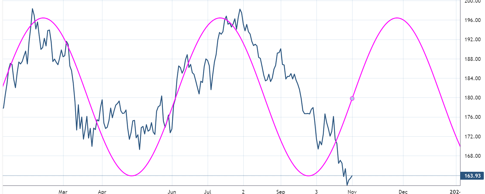 My cycle composite work suggests a period of upcoming weakness as well. Do not look at the price levels shown by the magenta line, but rather the time aspect of it.