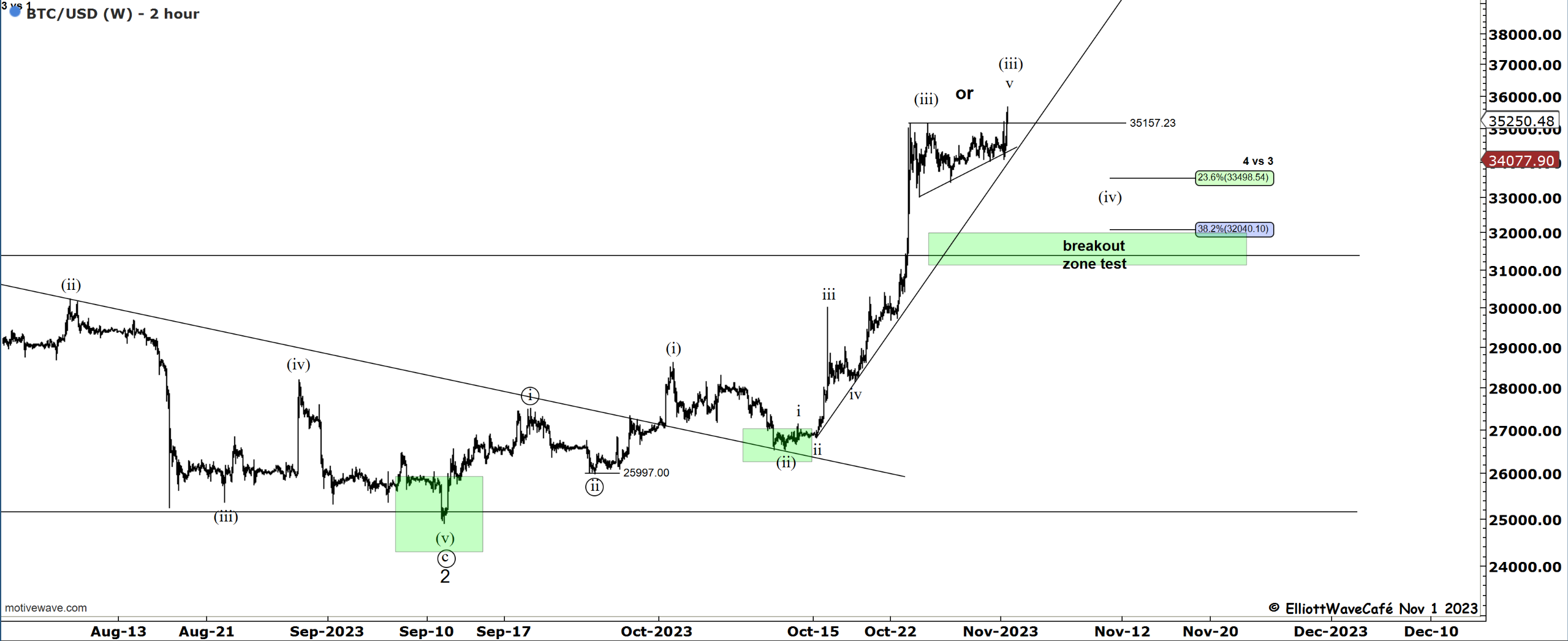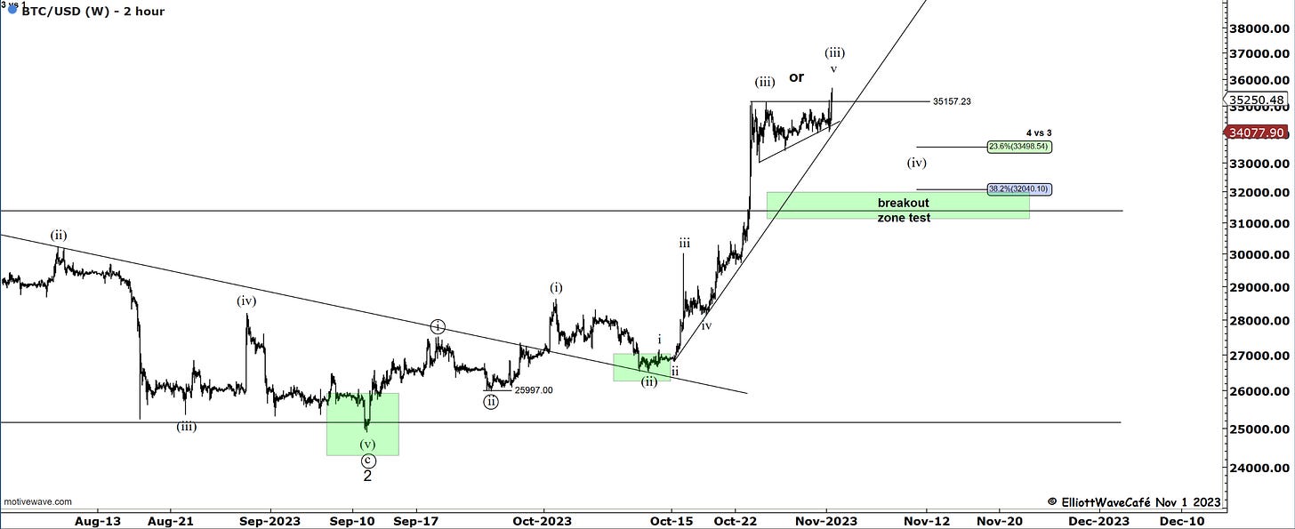 As discussed in yesterday’s piece, ascending triangles, as they call them in traditional TA, have a tendency to break upwards. The common expectation in EW after the triangle completes and breaks is for a reversal of prices into the next larger degree count. In our case, it is wave (iv). Even if this travels much higher, and I am wrong on the count, my suggestion is to keep trailing stops close and bail below 34k. Sometimes, these triangles appear in the middle of the move, which means there is the possibility of BTC running fast to 42k. It’s a tough bet to make after it already rallied over 7,000 points. Also, I have taken a quick glimpse at seasonality in BTC and it shows me quite a bit of underperformance from roughly Nov 9th to Dec 12th. I remain bullish on the larger structure, pending the usual corrections slowdowns.
