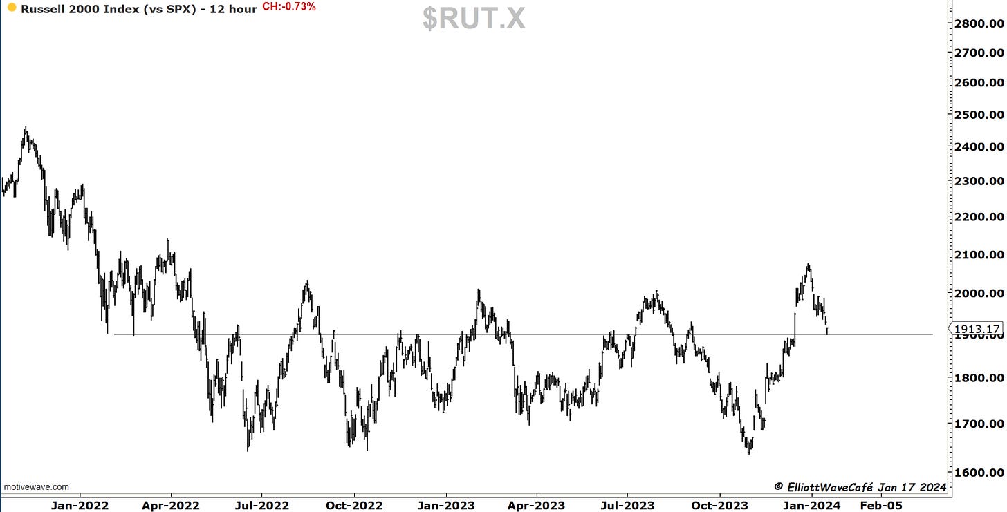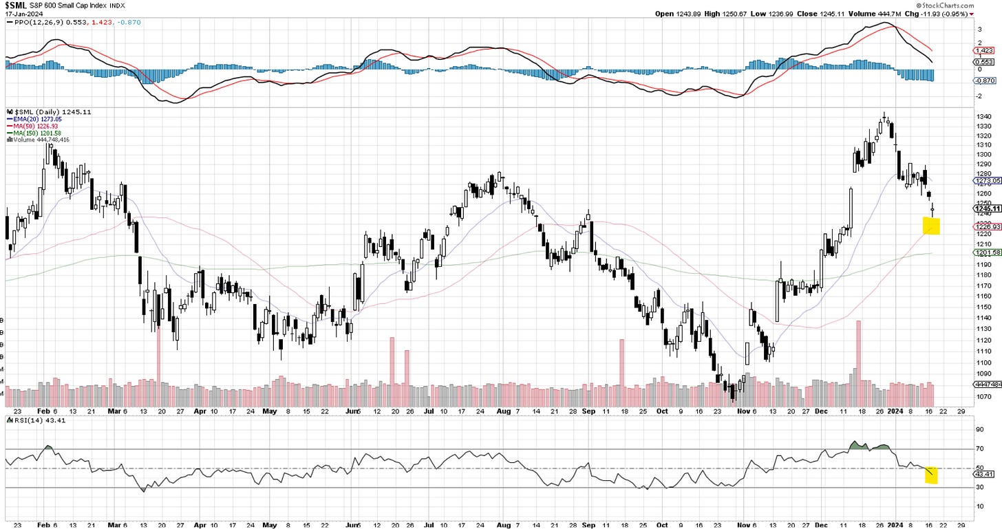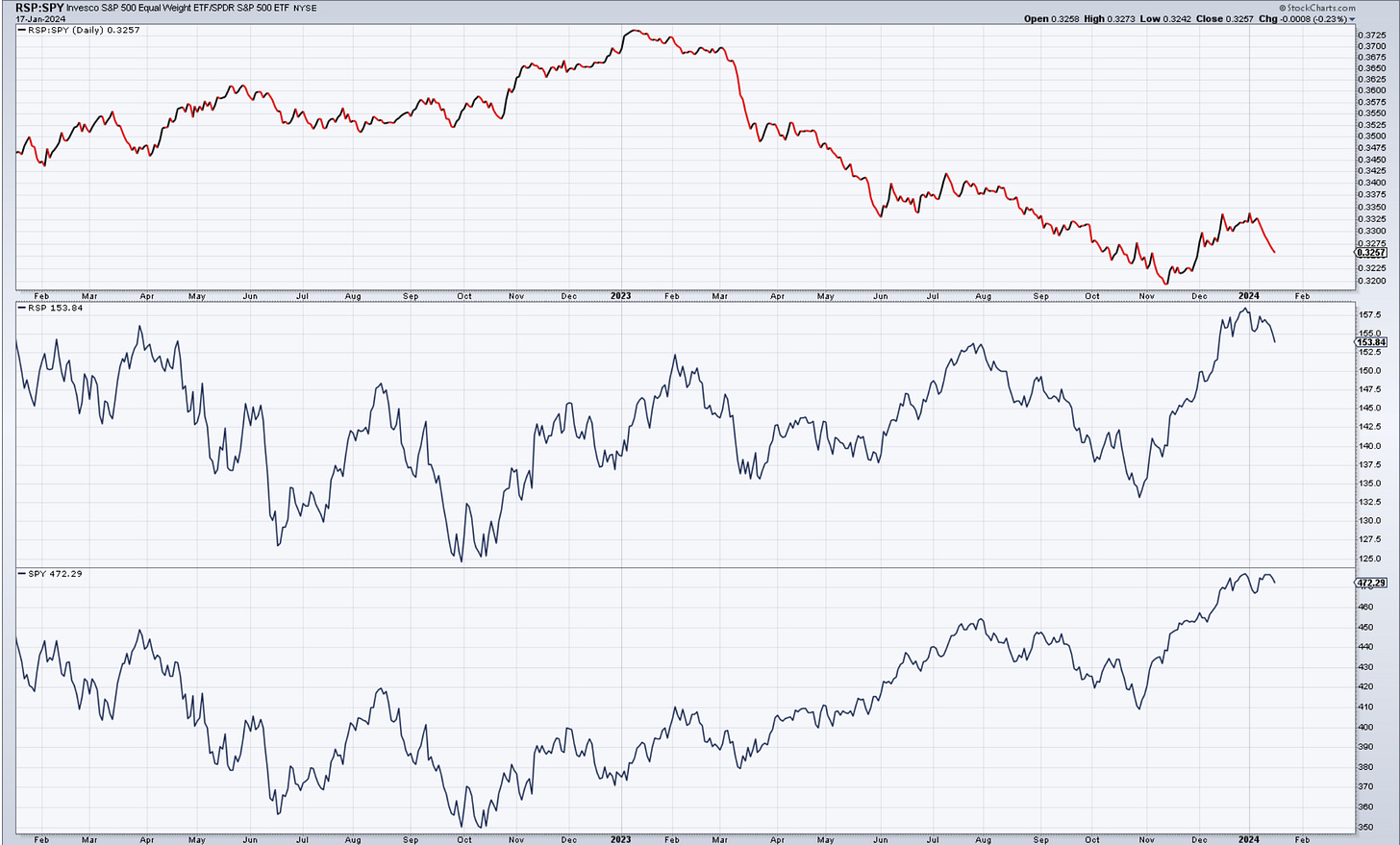 The top panel below is the relative ratio of equal-weighted SP500 RSP vs cap-weighted SPY. There was a major breadth of participation and excitement about all the stocks participating in a possible new “bull market.” This is shown with RSP outperforming SPY for the last couple of months of 2023. Since 2024 started, this has completely reversed, sending that ratio back lower. Once again, we have deterioration and weak breadth in multiple industries. I will continue to monitor this behavior as one of the weakest months of the year is approaching. To correct the entire advance from late last year, the current pullback is insufficient. I see RSP towards 145 and SPY towards 450.