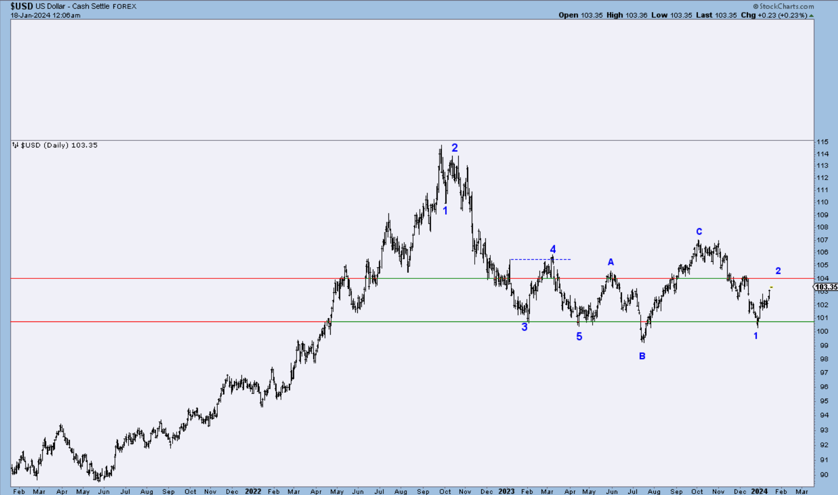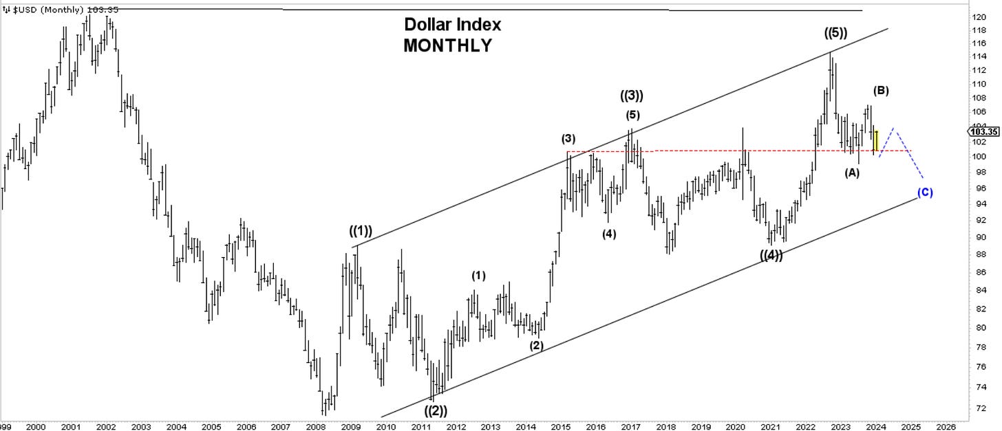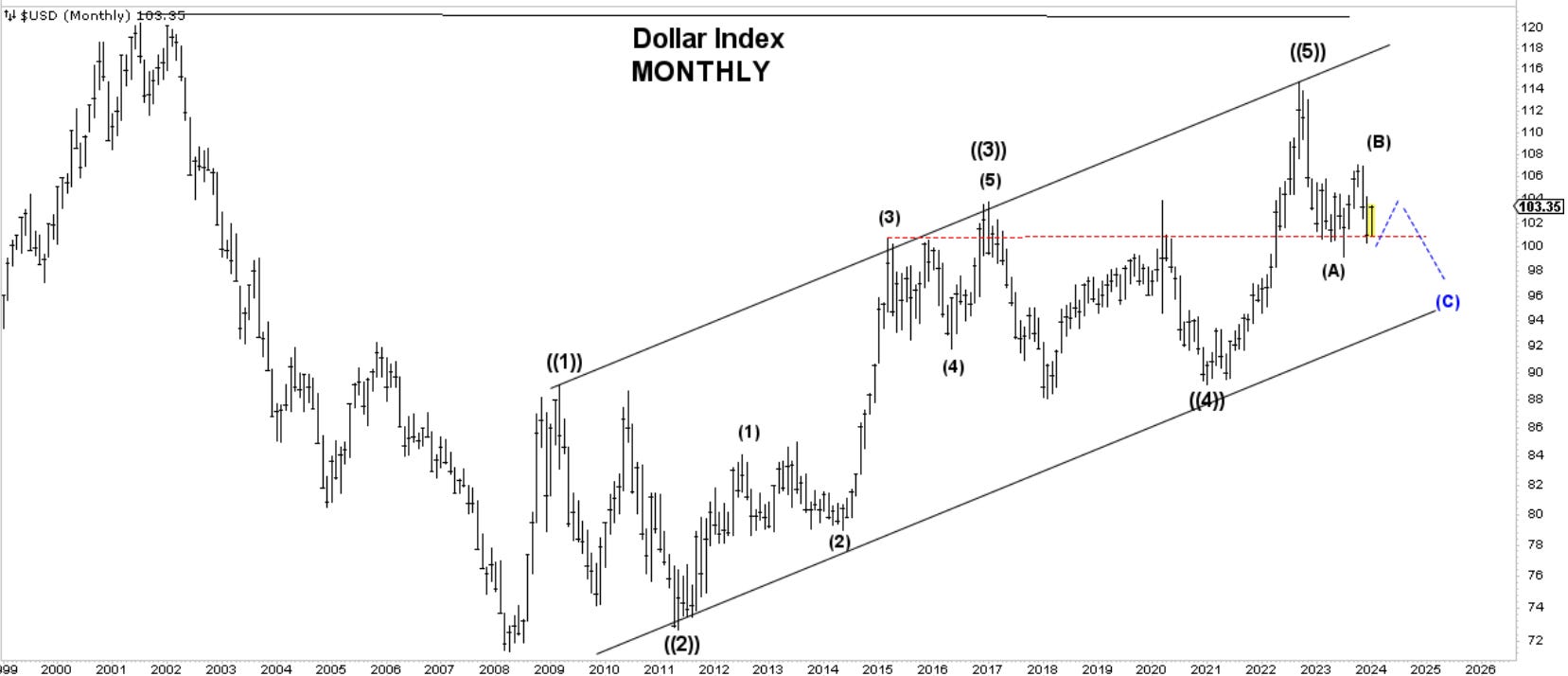 A few views of the dollar are below. Stalling a bit at horizontal resistance. In my view, it is the most complex instrument to analyze. There are a multitude of factors going into it. ( global trade, rate differentials, yields and many more). For simplicity, I resort to some basic wave counting and key zones. From a monthly perspective, there should be more downside, but only after this up-leg runs its course, and I don’t think we’re there yet.